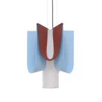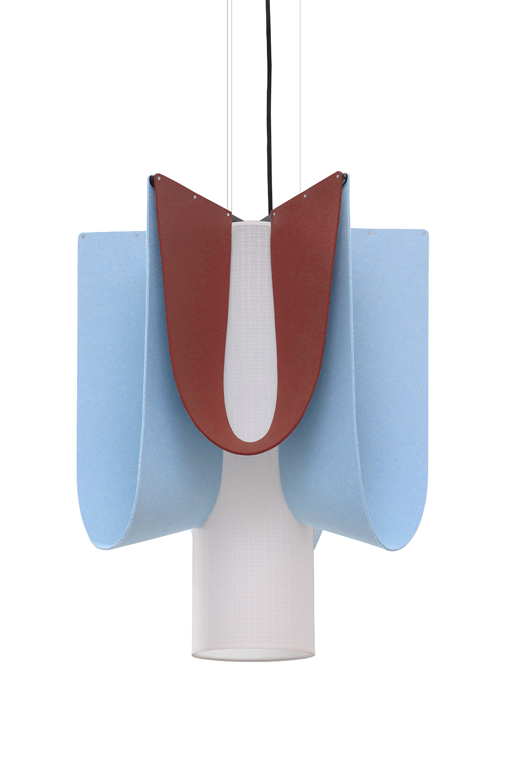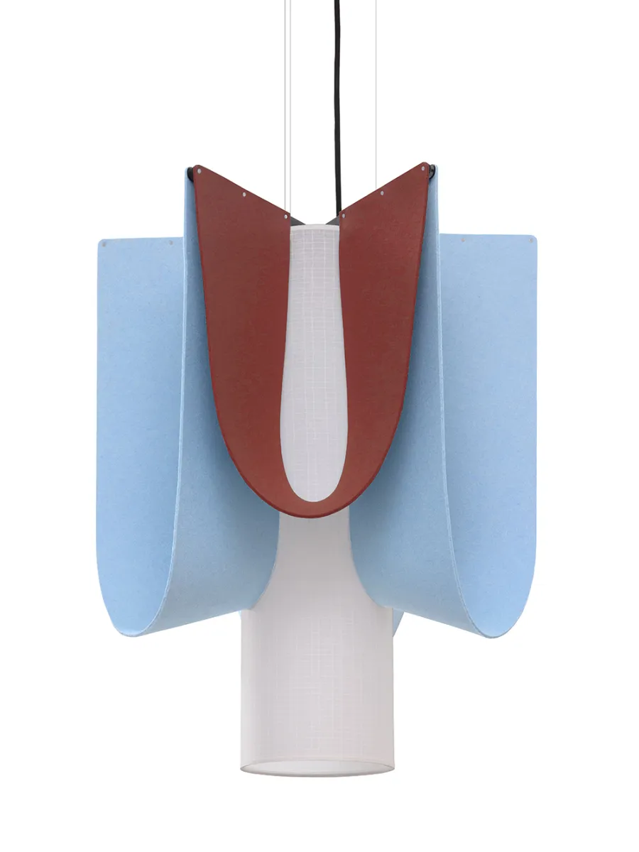 Inspired by mythology, Ondine symbolizes the fluid grace of water. The name reflects the poetry of a luminaire with light arctic blue and chilli red felt waves that unfurl through space in an undulation, absorbing unwanted noise.