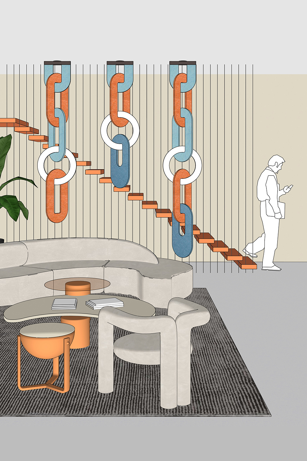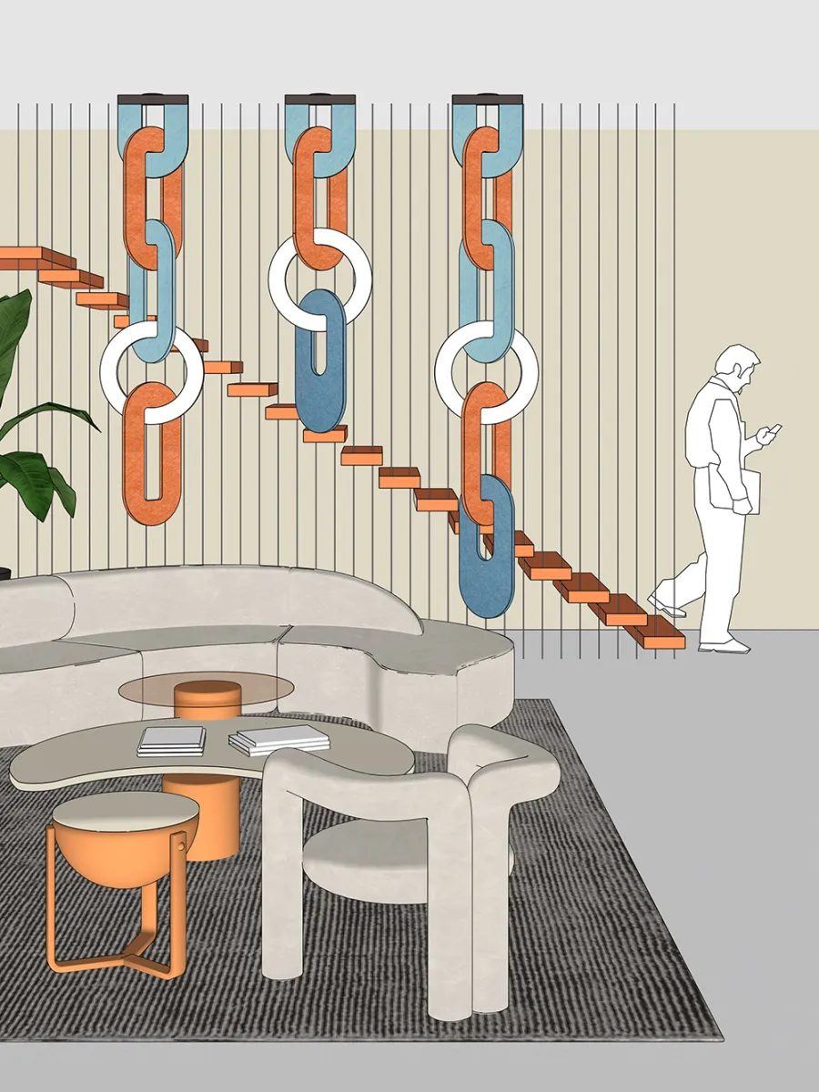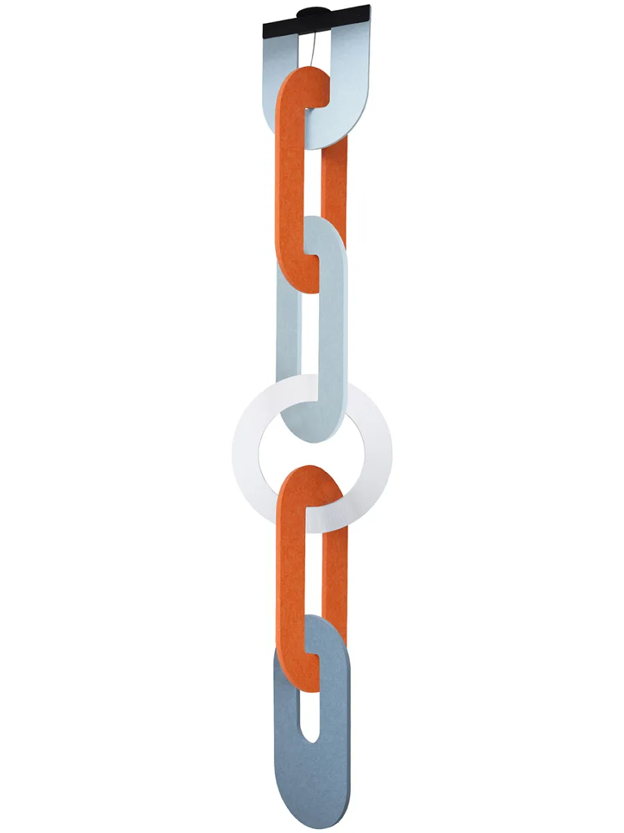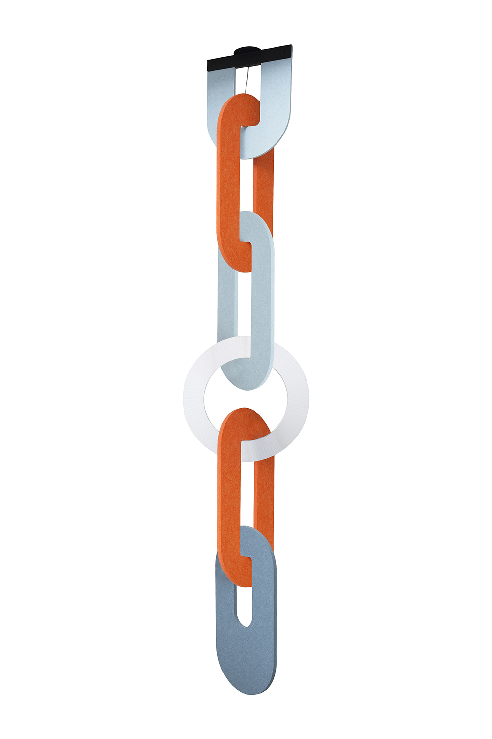 Composed of a variety of luminous acoustic rings, this modular suspended chain can be adapted in height to suit any space: from a simple office with a few modules, to huge spaces with numerous modules.