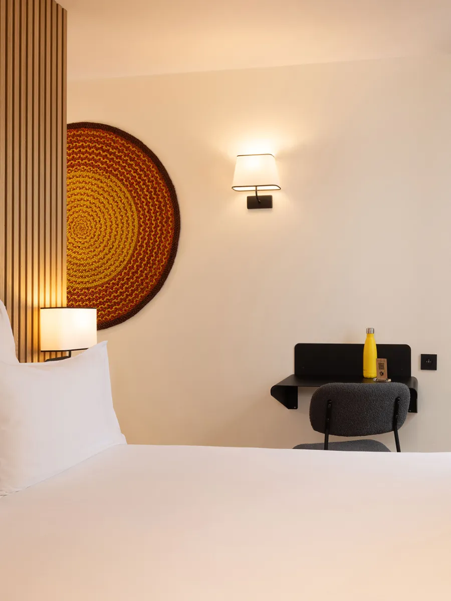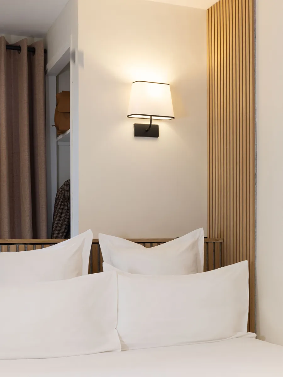 Son abat-jour en tissu blanc diffusant offre un éclairage secondaire doux et chaleureux, idéal pour créer une atmosphère cocooning dans une chambre ou un espace hôtelier. Elle peut également s’installer comme luminaire complémentaire aux autres modèles de la collection, conçus pour être fixés en chevet, en tête de lit. L’applique Escale existe aussi en version avec tablette et port USB, ainsi qu’avec une liseuse LED flexible ou un spot LED rotatif (gauche ou droite).