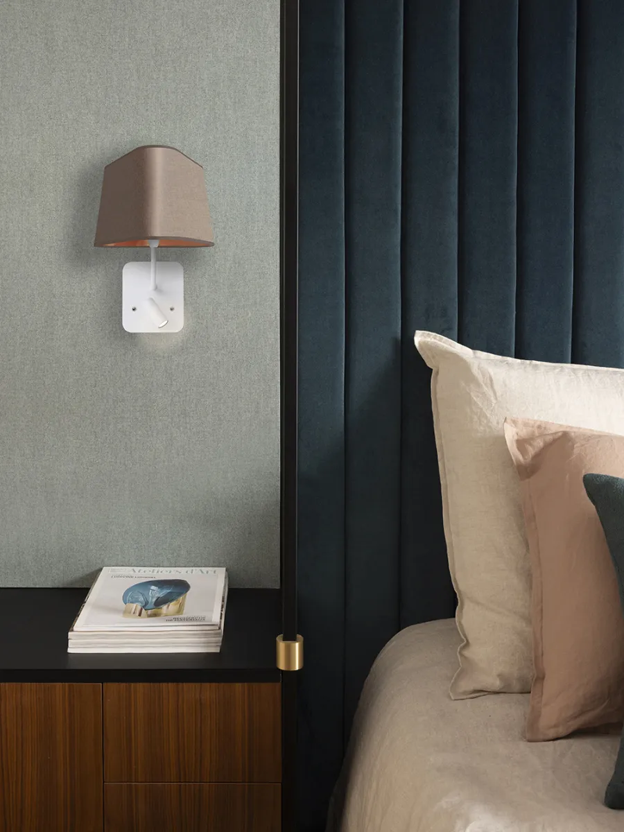 La collection Nuage, dont l’abat-jour triangulaire et arrondi s’apparente à la proue d’un bateau, a un design intemporel et universel. Entièrement fabriquée en France, Nuage est la collection best-seller de DESIGNHEURE, grâce à sa très grande adaptabilité et ses nombreuses déclinaisons de modèles. Très décoratives et idéale en tête de lit, l’applique murale petit Nuage offre une double source lumineuse : ampoule et liseuse LED flexible. Cette version LED avec double interrupteur est particulièrement recommandée pour une lecture confortable avec ou sans l’éclairage de la lampe principale. Elle se compose d’une patère d’alimentation rectangulaire et d’une tige murale en acier blanc laqué, et d’un abat-jour en tissu beige satiné à l'extérieur et doré à l'intérieur. La simplicité et la pureté des lignes de son apparence apportent élégance et légèreté à vos intérieurs.