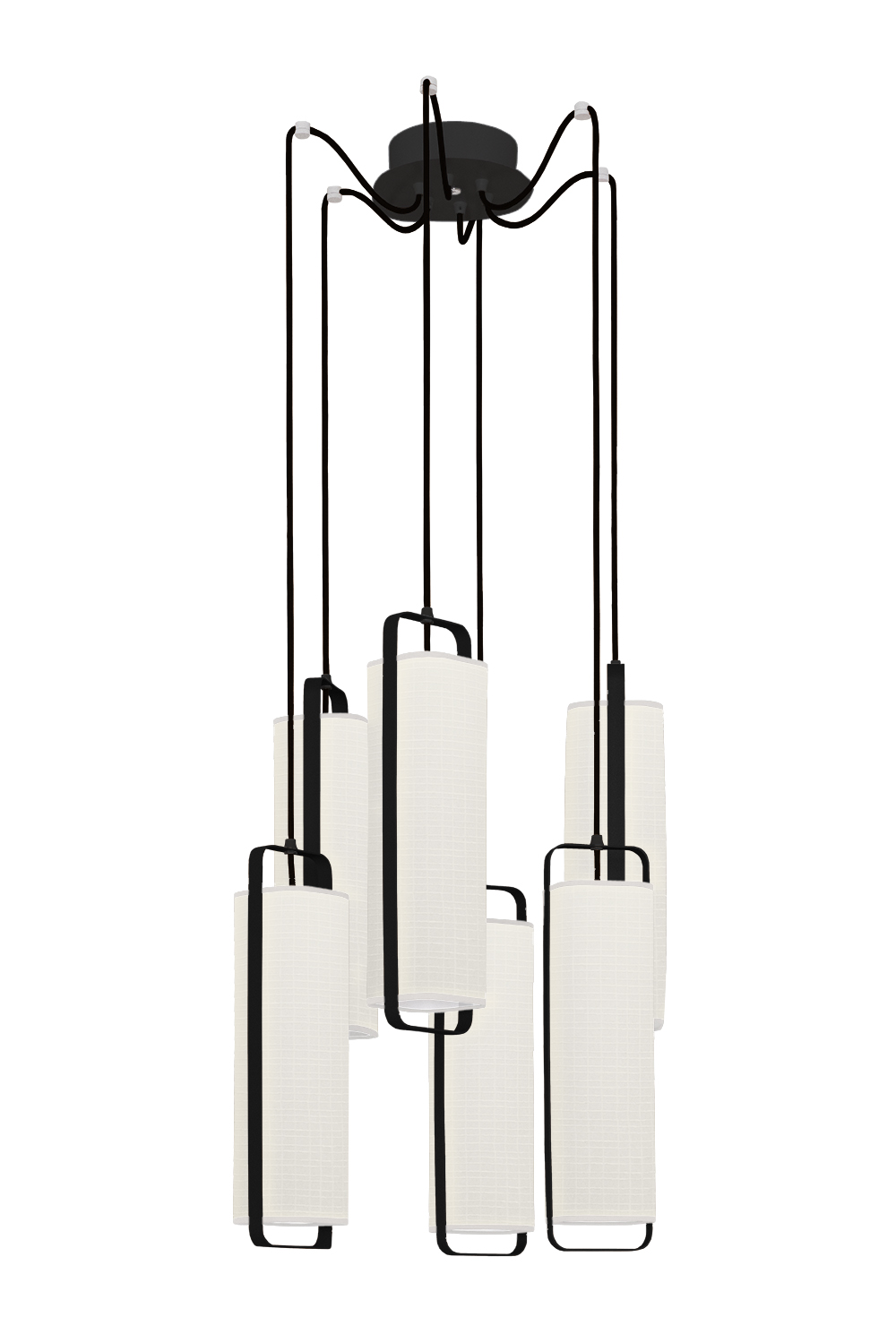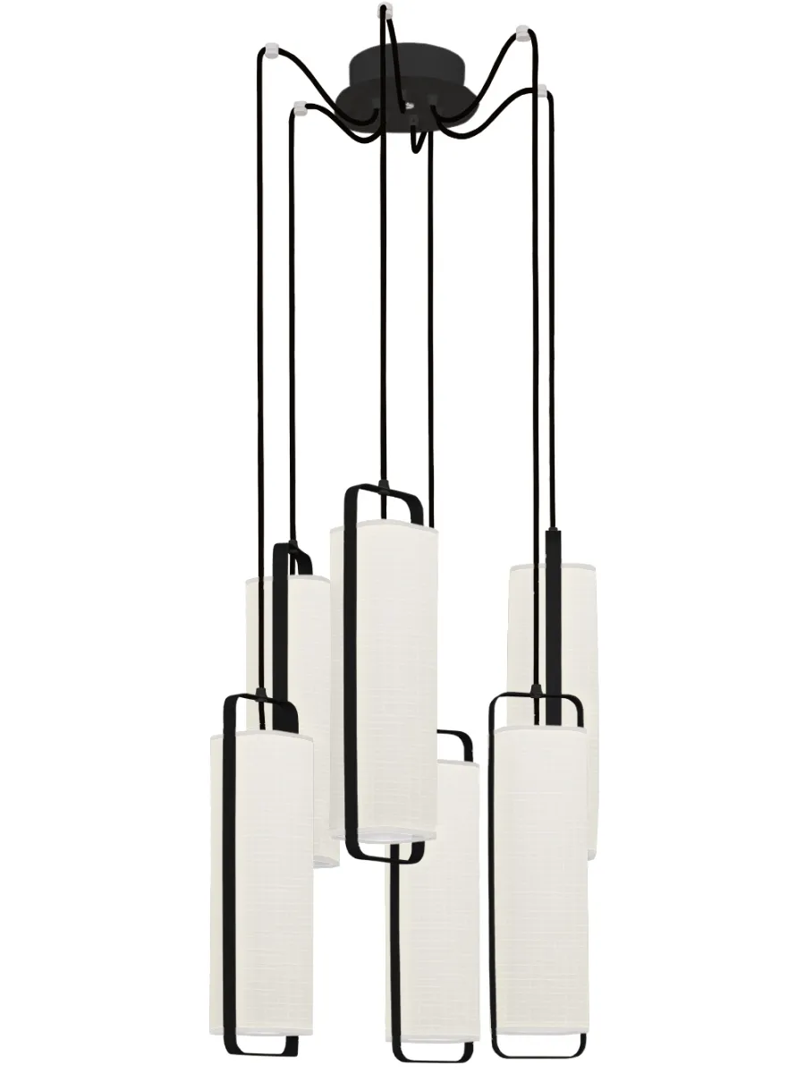 The 6 Twiggy chandelier consists of a black textured steel armature framing each of the six lampshades in japanese white paper-effect finish, suspended by black textile cords, and a black ceiling rose. The Twiggy collection, with its slender, minimalist and elegant design, plays with contrasts, textures and geometry, highlighting the textile material with a halo of light shimmering like a candle.
