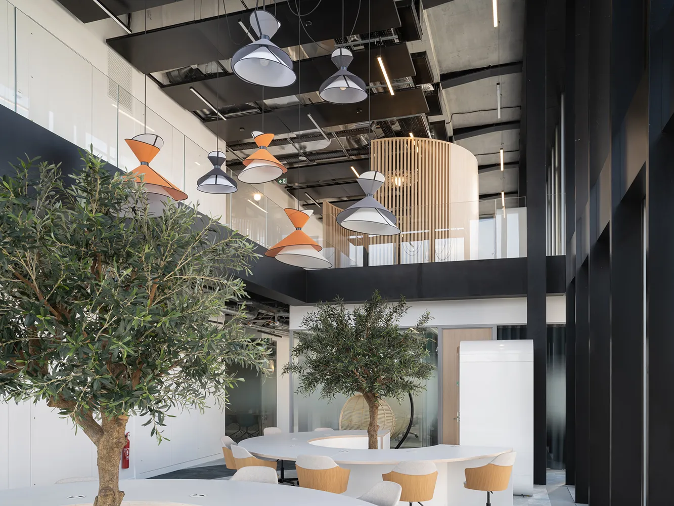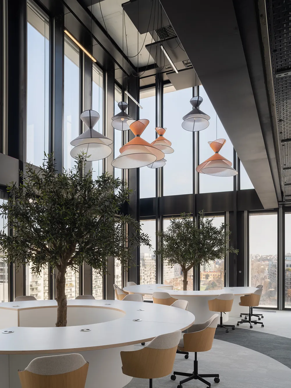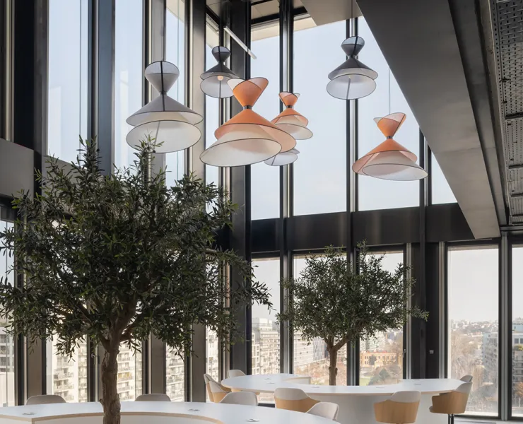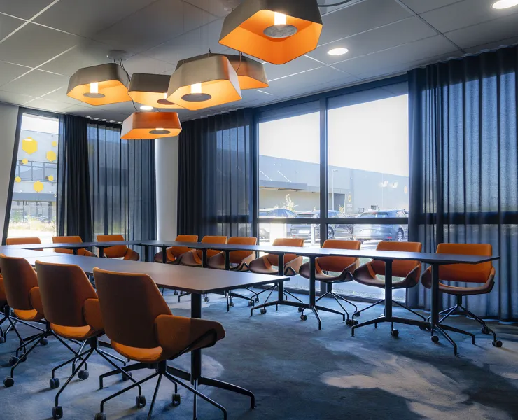 Au cœur de ce projet d’envergure, une des salles de réunion se distingue par un parti pris chromatique affirmé. Deux suspensions Trio Petit Nénuphar orange et marron insufflent une touche vitaminée et graphique, faisant écho aux assises orange, tandis que les tonalités bleutées de la moquette et des rideaux structurent l’espace.