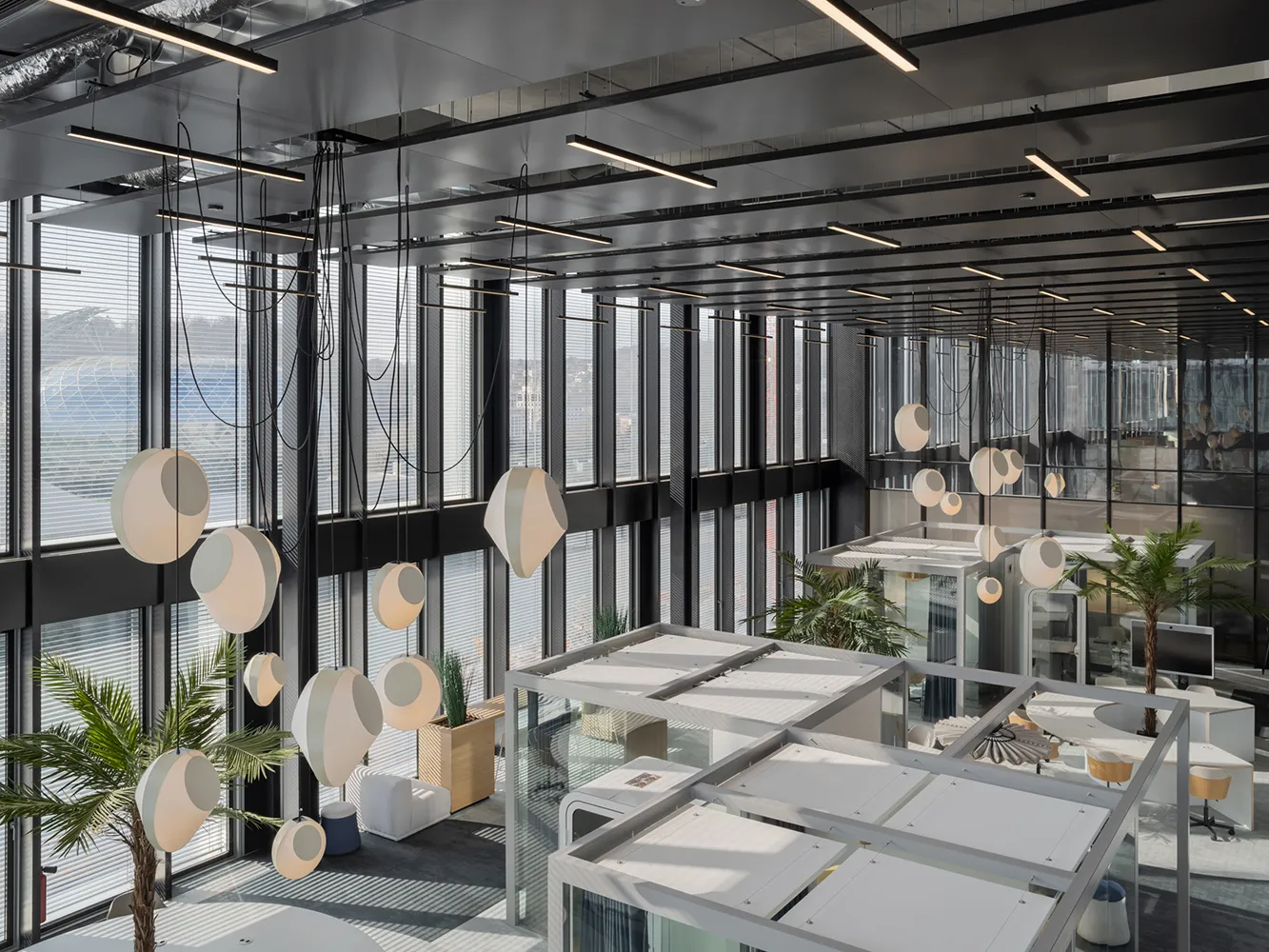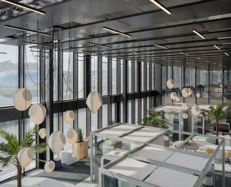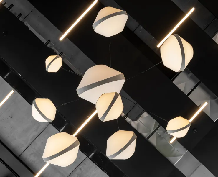 Pensés par Office-In, les bureaux d'Odigo accordent une place centrale à la lumière, à travers de larges ouvertures vitrées mais aussi grâce à trois lustres DESIGNHEURE qui structurent l’espace autant qu’ils le questionnent. Ici, l’éclairage ne se contente pas d’accompagner les usages : il participe activement à la lecture du lieu.