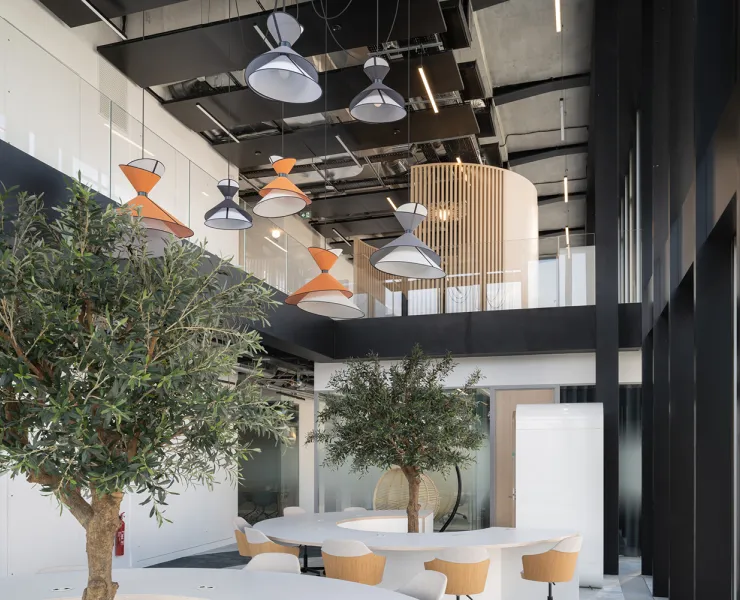 Plus loin, dans la seconde partie de l’open space, au-delà des boxes insonorisés, le lustre 7 Mixte Kimono assume une écriture plus expressive. Le dessin atypique de ses abat-jour insuffle une énergie vitaminée, favorisant créativité et optimisme au cœur des échanges.