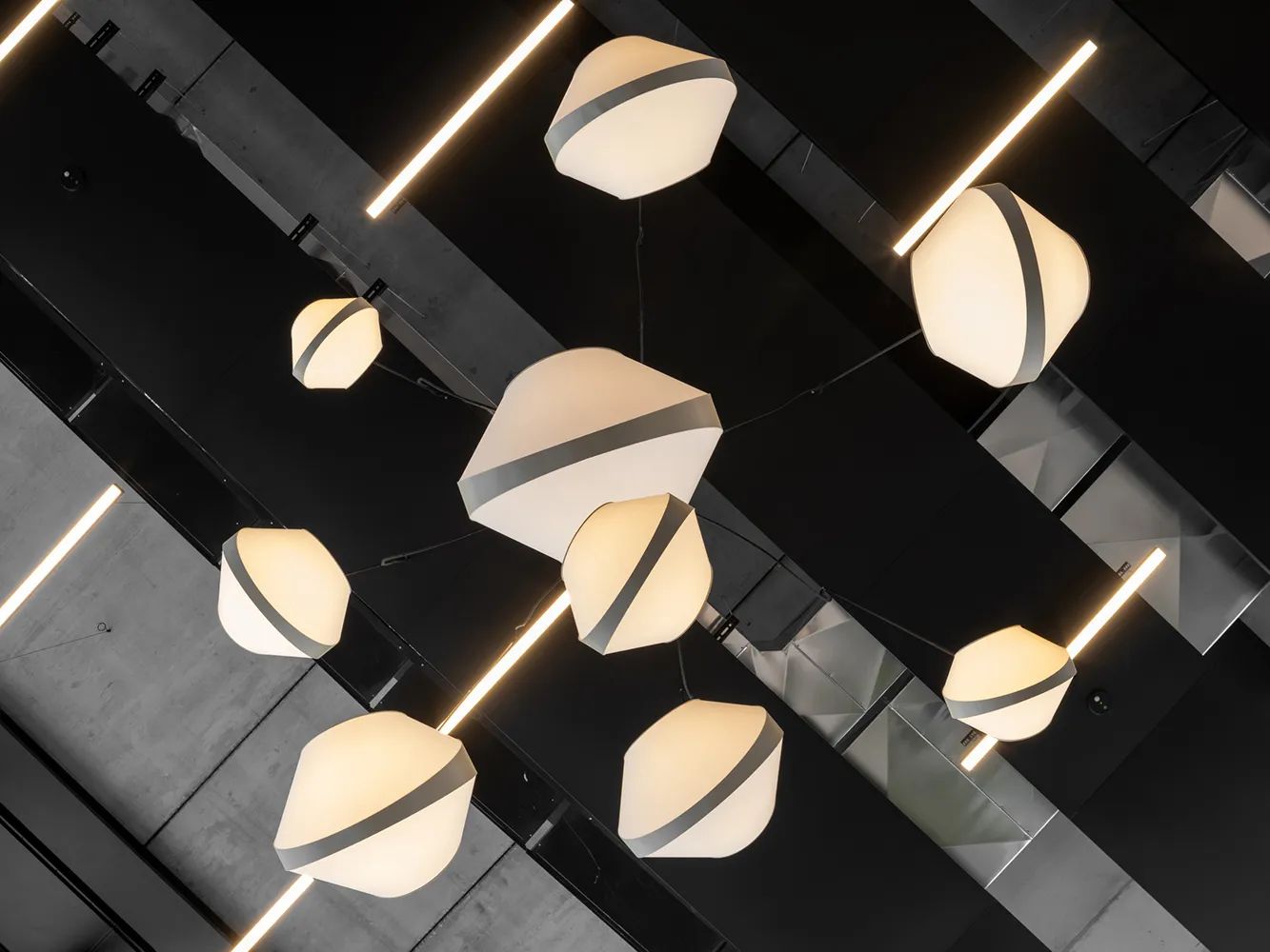 Les plafonniers Trio Petit Nénuphar, déclinés en Noir & Blanc, structurent et signalent l’espace d’accueil tout en affirmant l’identité visuelle de la marque.