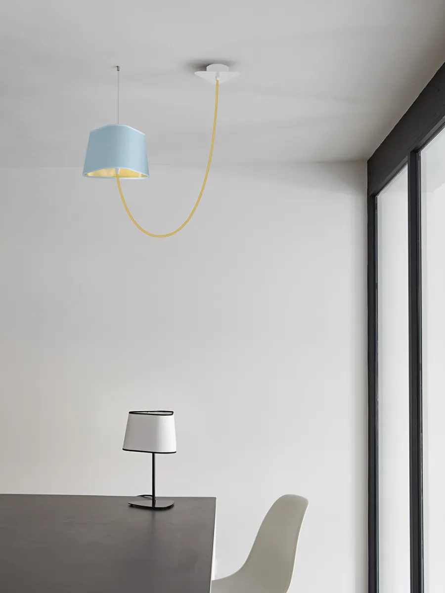 The Nuage collection is an elegant and ingenious concept in nomadic lighting. Its lightness and adaptability make it the best-seller of the Designheure collections. Simplicity and purity of line are the hallmarks of this timeless, universal collection. The triangular lampshade produces a very distinctive light, cutting through the space in an architectural way. Its elegant lines, reminiscent of the prow of a ship, are enhanced by the textile cord. The bespoke nature of this collection means you can create unique projects.