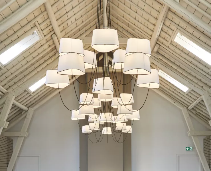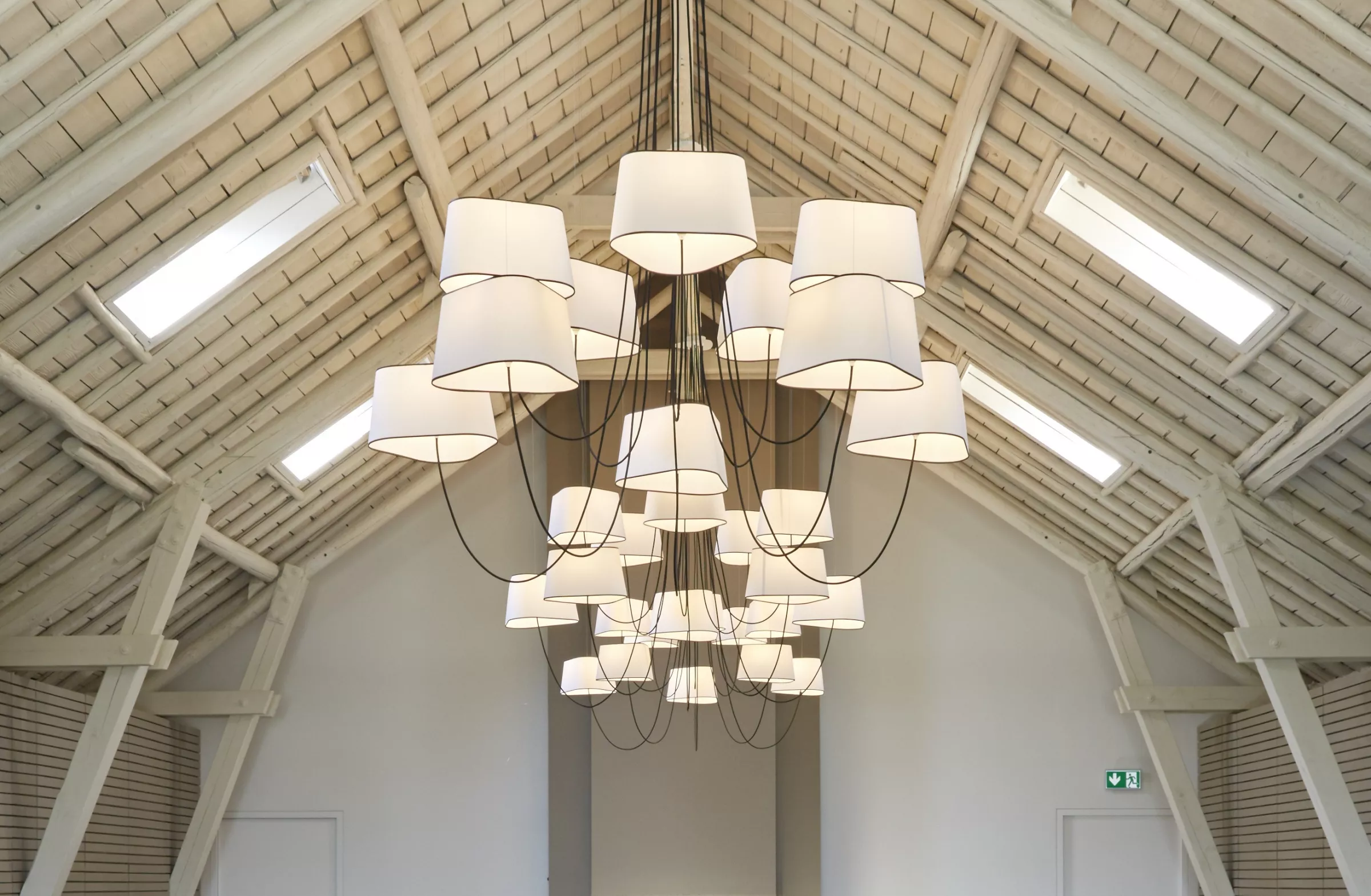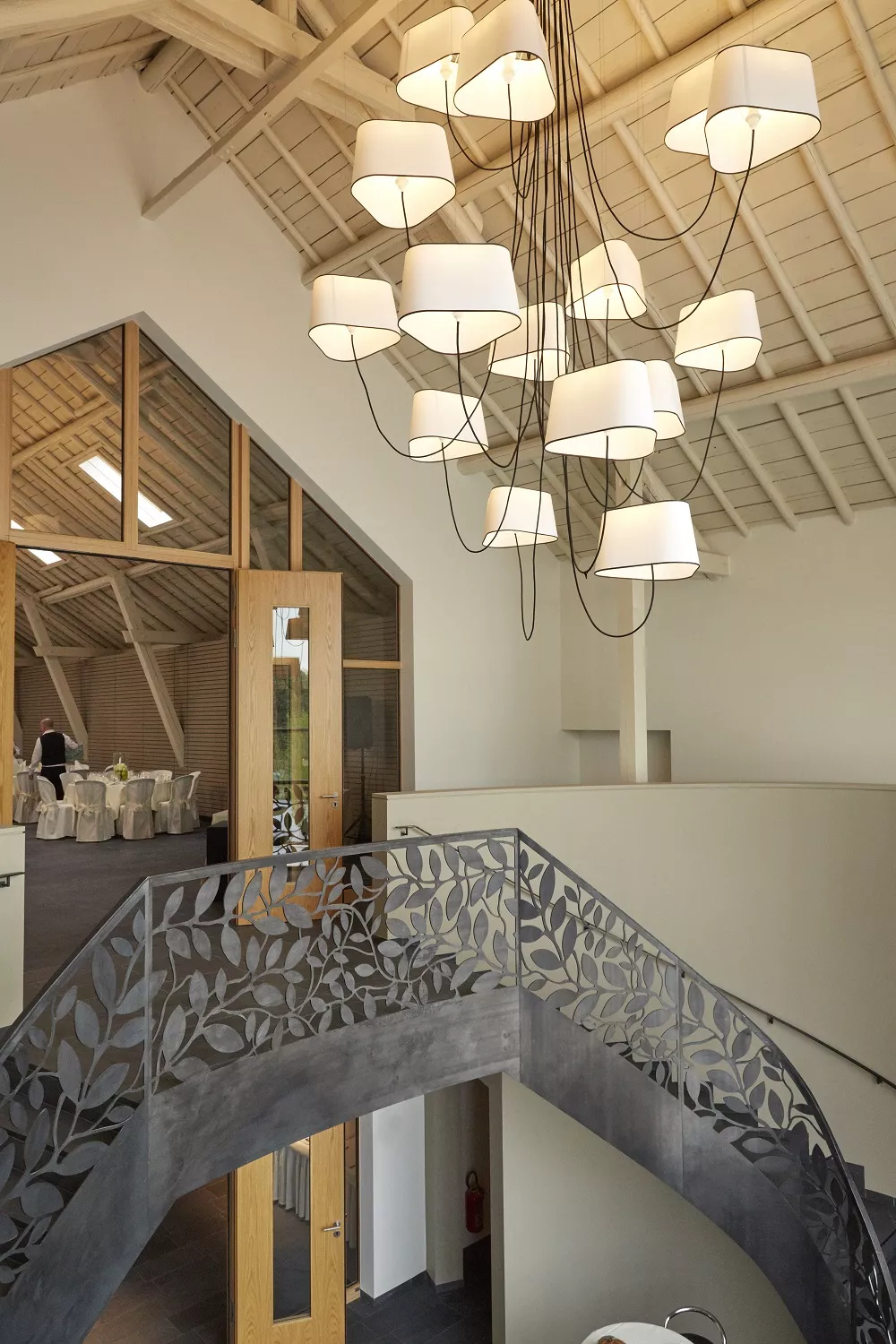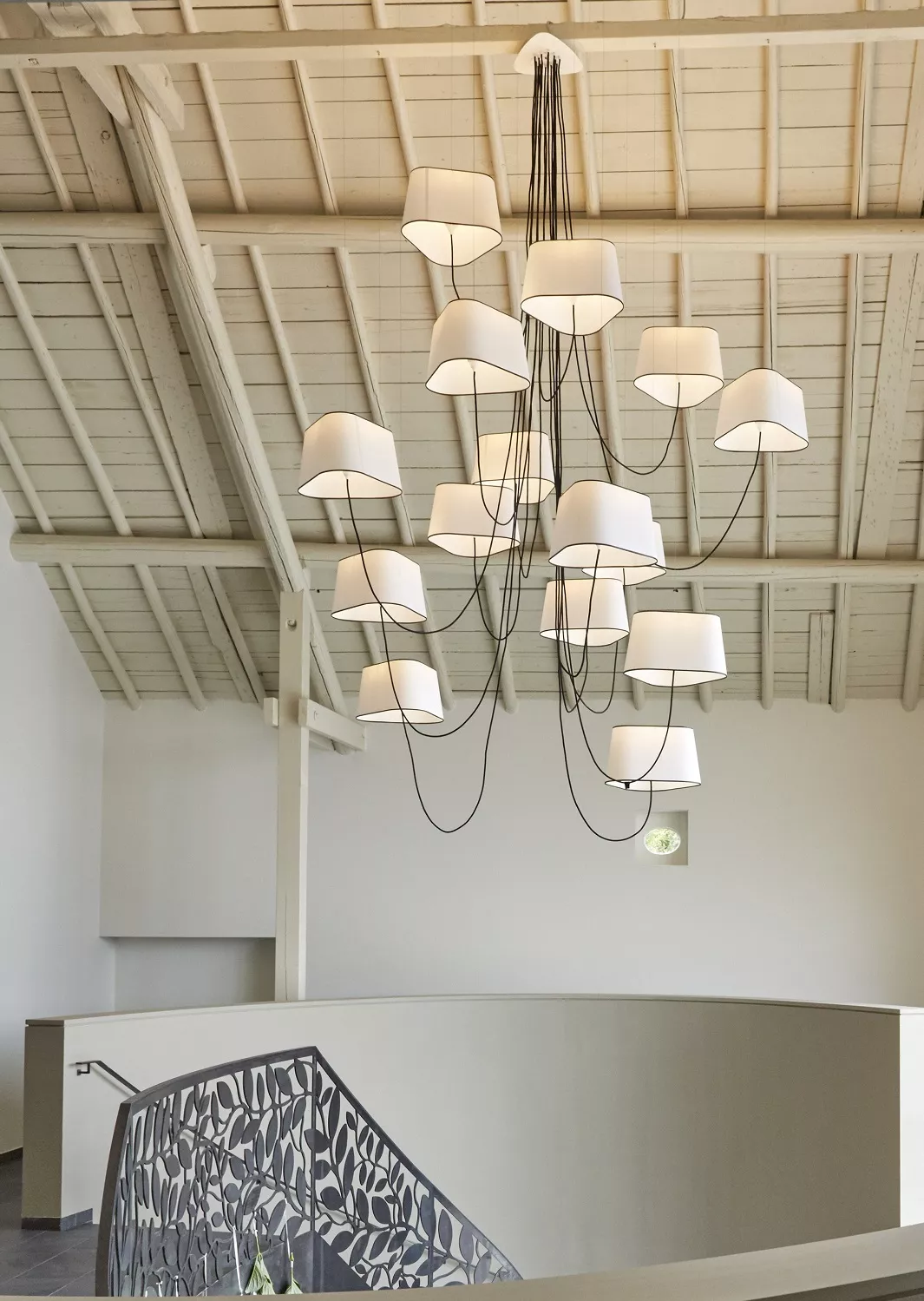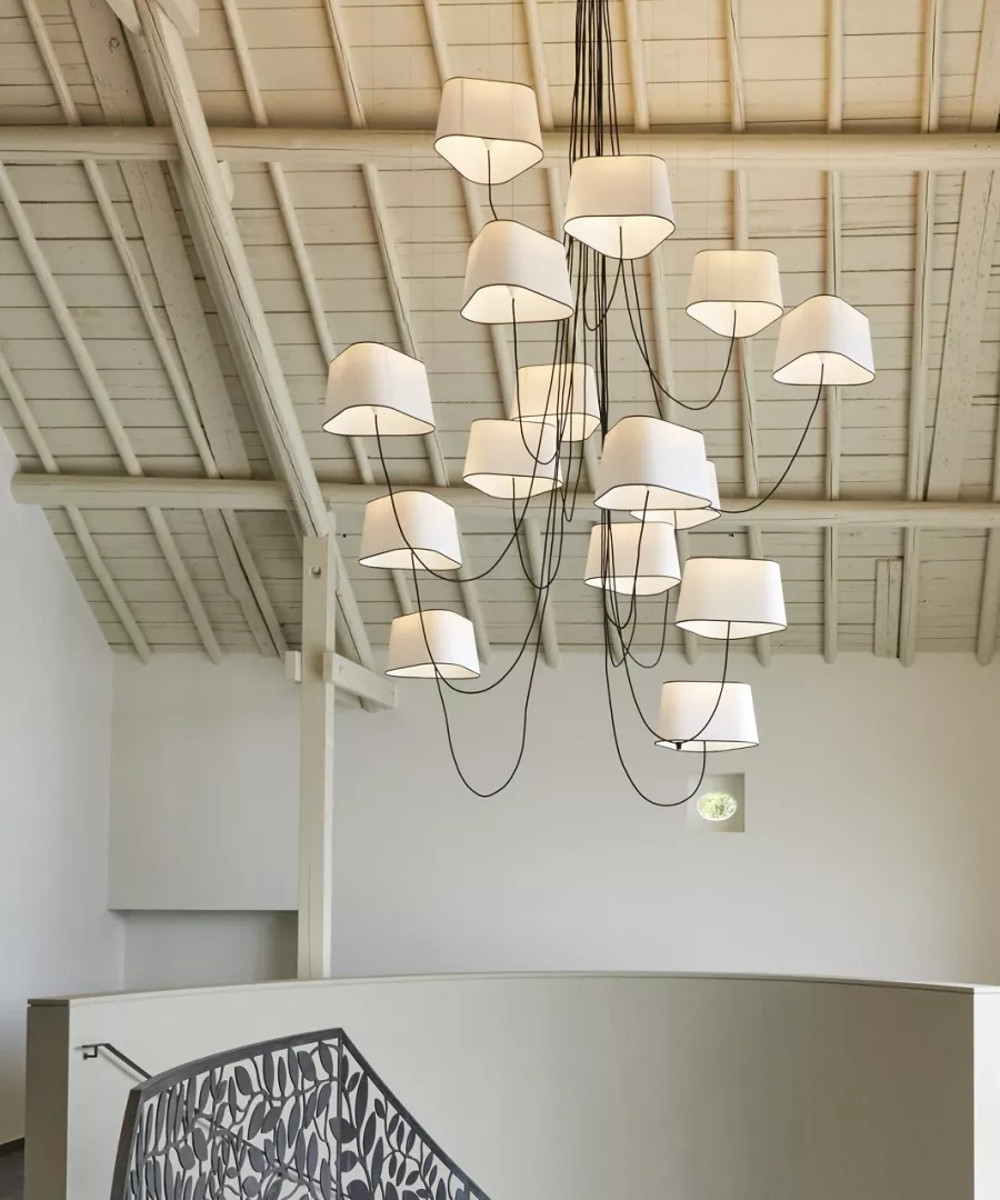 A Chandelier 15 Grand Nuage, with diffusing white lampshades edged with black borders, stretches majestically across the stairwell in a bespoke deconstructed composition, to take advantage of all the headroom.