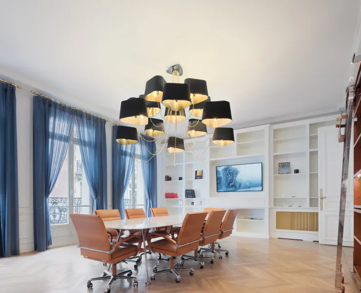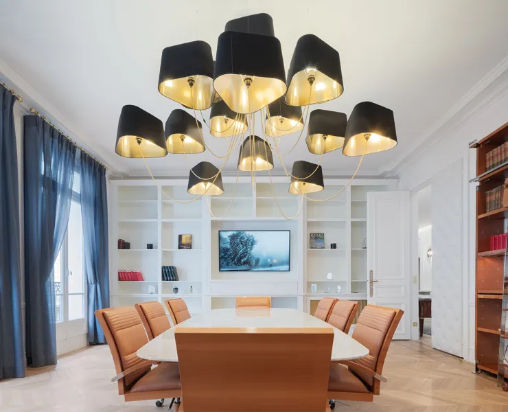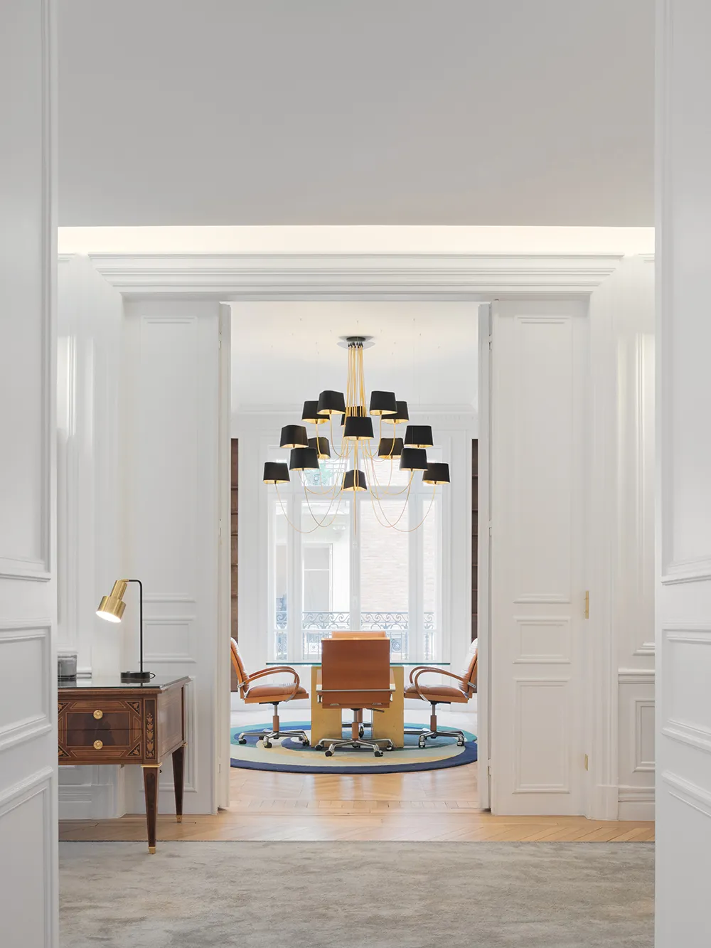 In this historically rich setting, the lighting design is based on a delicate balance. The Nuage chandeliers, crafted to order in a Black & Gold finish, introduce a contemporary touch without disrupting the existing harmony.