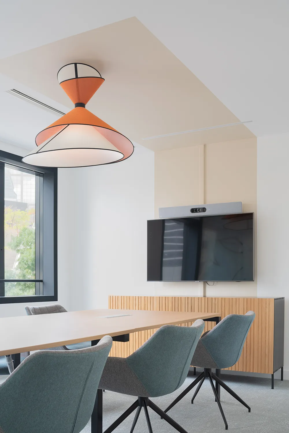 The meeting room is part of this approach. The XL Kimono pendant light plays a central role here. With its light presence and design inspired by the world of textiles, it subtly evokes the brand’s identity. It enhances the space without weighing it down, whilst ensuring the screen remains clearly visible.