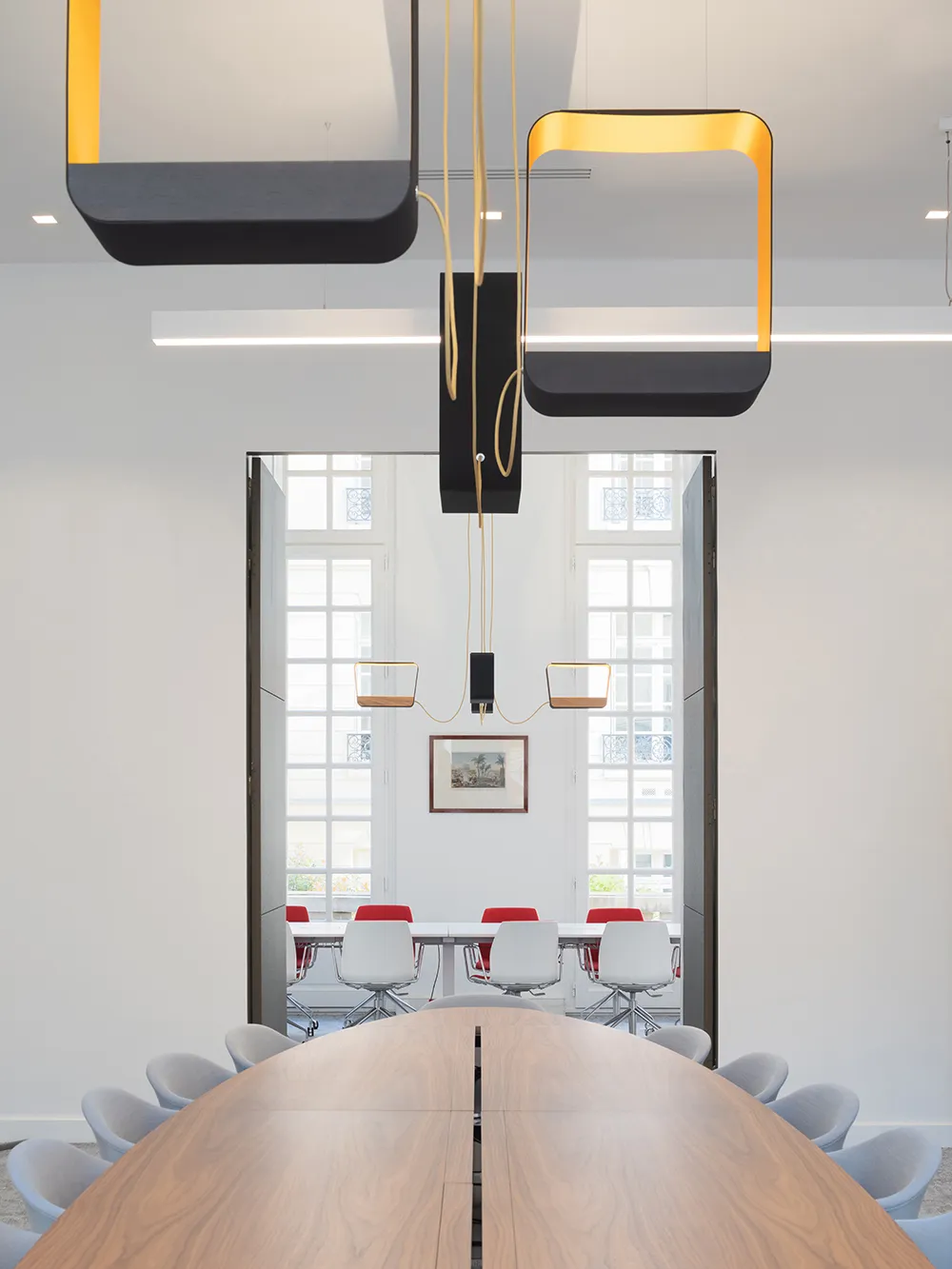 At the heart of the meeting rooms, the Eau de Lumière chandeliers reinforce this intention. Their geometric forms introduce a discreet rigour that engages with the architecture. The natural oak finishes, meanwhile, extend the aesthetic of the large tables, creating a subtle material continuity.