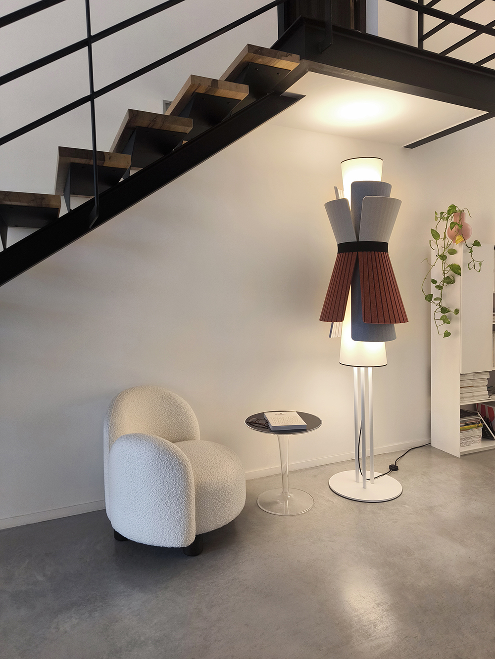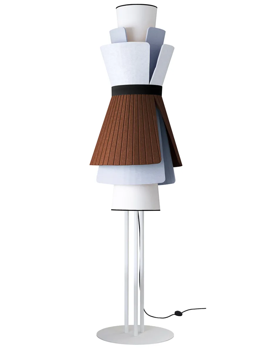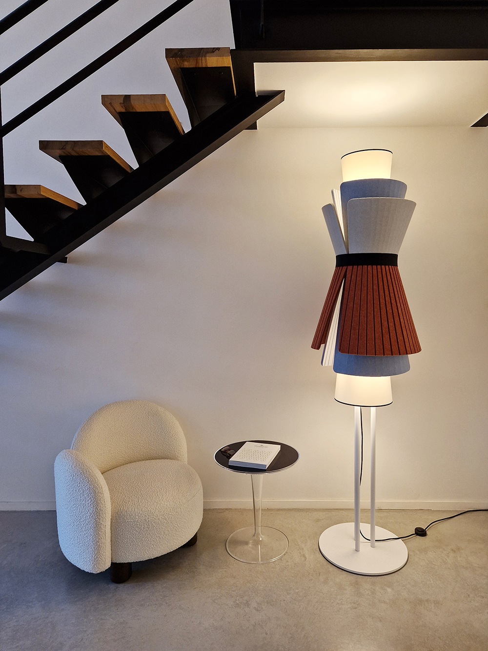 Rhapsodie acoustic floor lamp evokes the harmony of a free-flowing musical composition. Its Gull grey, Terracotta & Winter sky blue acoustic skirts delicately envelop the light source, providing a double diffusion of light, upwards and downwards, while absorbing unwanted noise.