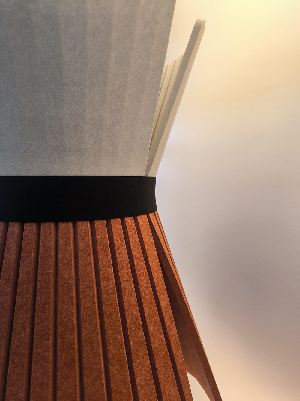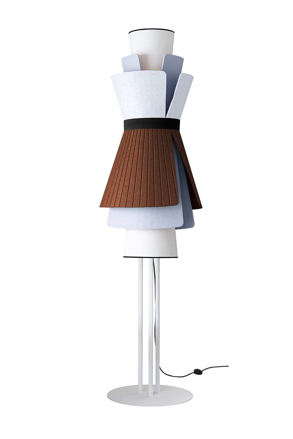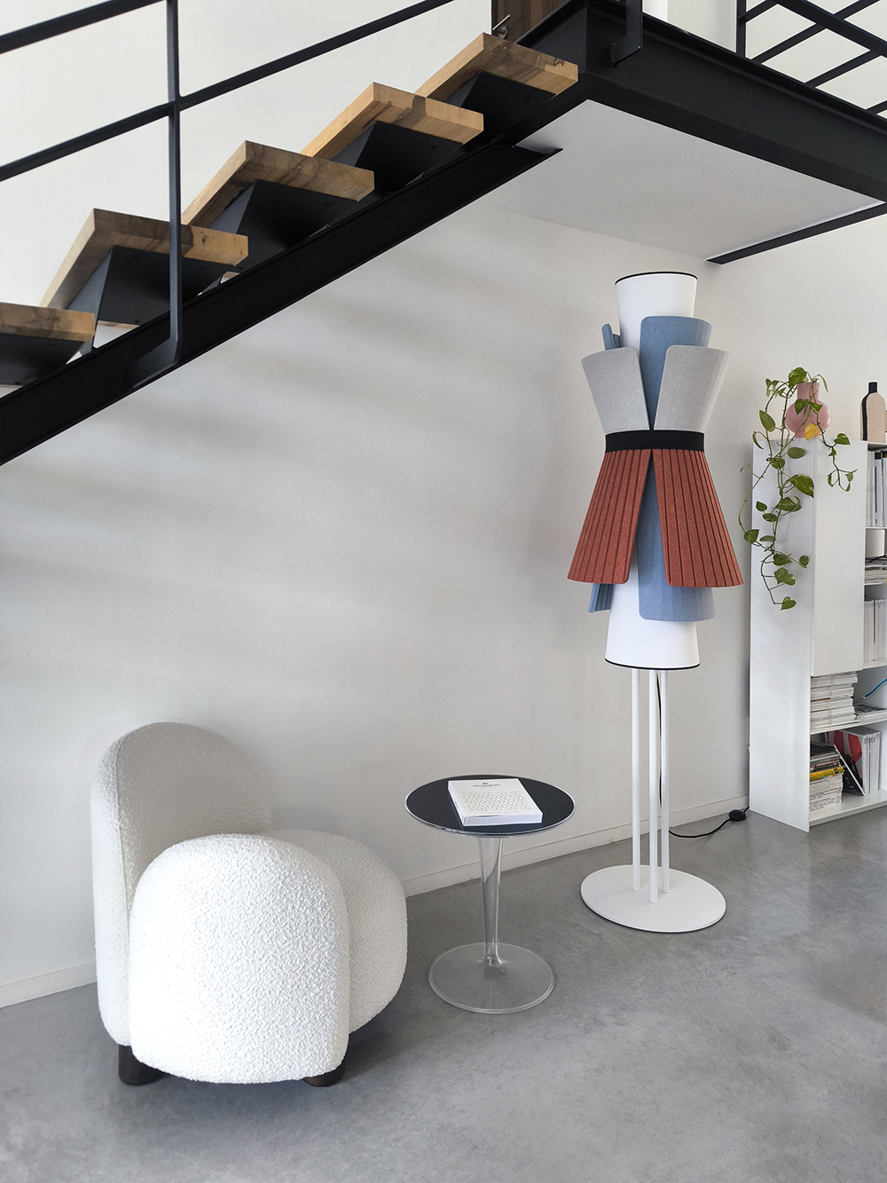 Rhapsodie acoustic floor lamp evokes the harmony of a free-flowing musical composition. Its Gull grey, Terracotta & Winter sky blue acoustic skirts delicately envelop the light source, providing a double diffusion of light, upwards and downwards, while absorbing unwanted noise.