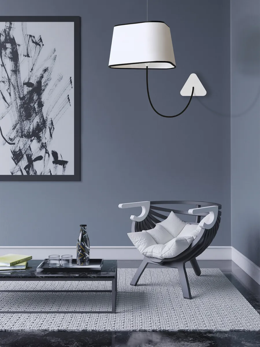 La collection Nuage, dont l’abat-jour triangulaire et arrondi s’apparente à la proue d’un bateau, a un design intemporel et universel. Entièrement fabriquée en France, Nuage est la collection best-seller de DESIGNHEURE, grâce à sa très grande adaptabilité. L’applique Suspendue Grand Nuage est idéale en tête de lit ou dans un salon. Pratique, cette applique permet de déporter la lampe de la sortie électrique. Suspendue à un câble acier de 2m ajustable, la hauteur de l’abat-jour est réglable. Elle se compose d’une patère d’alimentation triangulaire en acier blanc laqué, d’un cordon électrique en textile noir et d’un abat-jour en tissu blanc diffusant bordé de galons noirs donnant un effet graphique. La simplicité et la pureté de ses lignes apportent élégance et légèreté à votre projet.