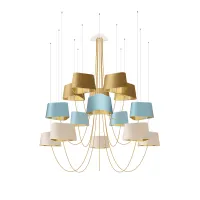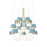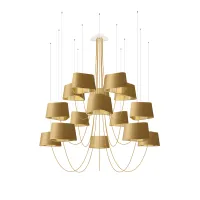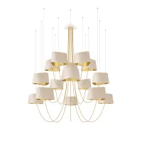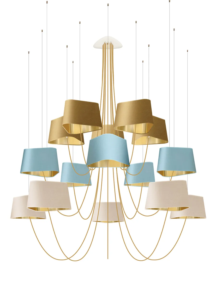 Ce magnifique lustre aérien semble flotter dans les airs grâce à son esprit nomade et poétique. Les abat-jours triangulaires et arrondis de la collection Nuage s’apparentent à la proue d’un bateau avec un design intemporel et universel. Modulable, ce lustre est réglable en hauteur et en diamètre : Fixés sur des câbles en acier, les abat-jours peuvent être montés ou descendus grâce à un piston situé sur leur partie supérieure. Notre atelier ajuste les longueurs de câble et de fil selon les dimensions de votre intérieur, pour vous fabriquer un lustre sur-mesure prêt à poser. Il se compose de 15 grands abat-jours en tissu blanc à l’extérieur et cuivré-rosé à l’intérieur, chacun alimentés par des cordons en textile blanc décoratifs montés sur une patère blanche. Son éclairage apporte une lumière bien particulière, découpant l’espace de façon architecturale.