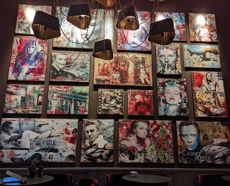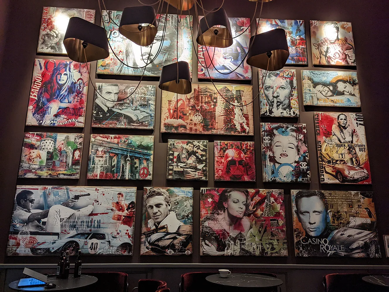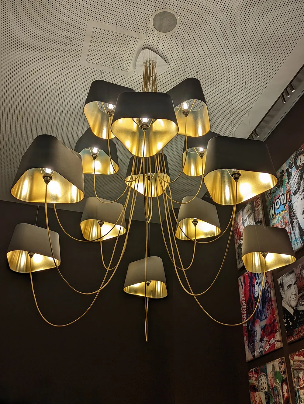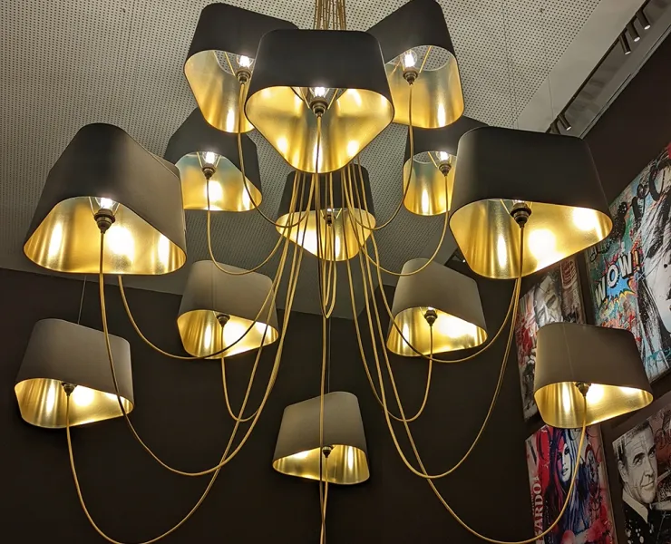 Comme en apesanteur, ce luminaire sculptural déploie une constellation d’abat-jour noirs aux reflets dorés, créant un contraste chaleureux et graphique. Sa présence structure l’espace, capte le regard et compose un jeu de volumes spectaculaire au-dessus des tables. Dans ce décor volontairement sombre et intimiste, la lumière devient matière : une touche décorative idéale pour un restaurant exclusif où chaque détail compte.