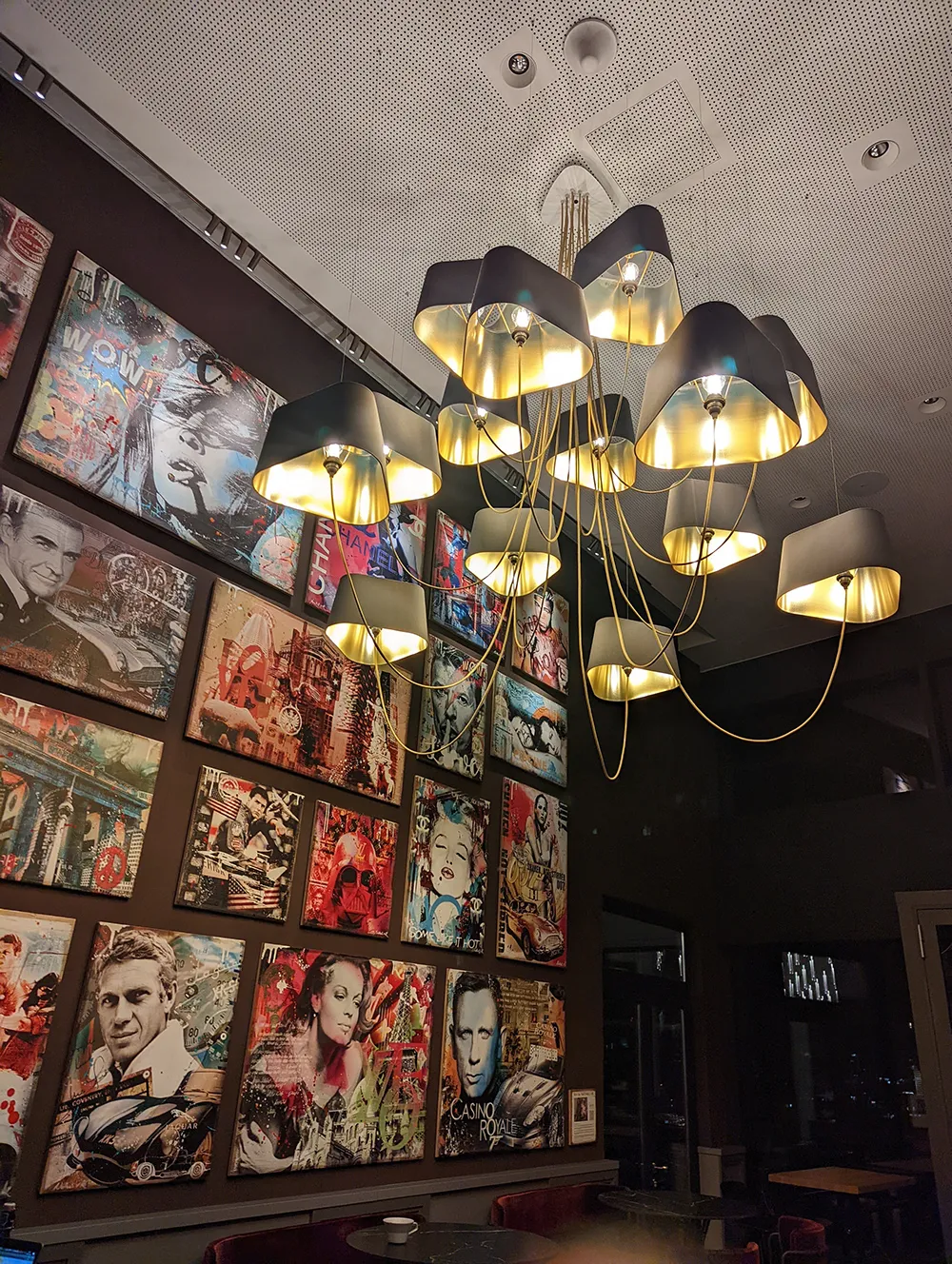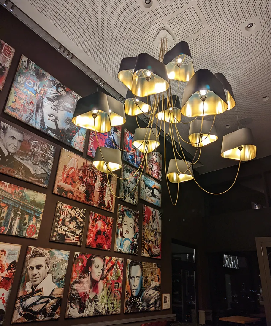 Dans l’atmosphère feutrée et confidentielle du restaurant de l’Hôtel Meliá Frankfurt, le lustre 15 Grand Nuage noir et or apporte une élégance lumineuse haut de gamme.