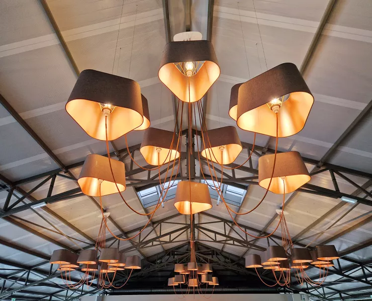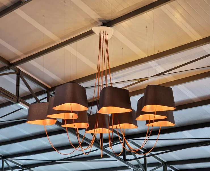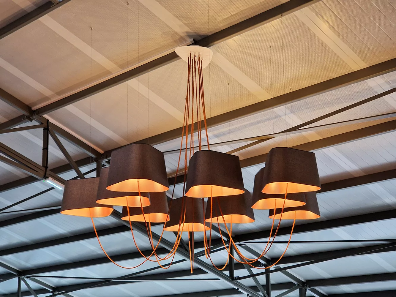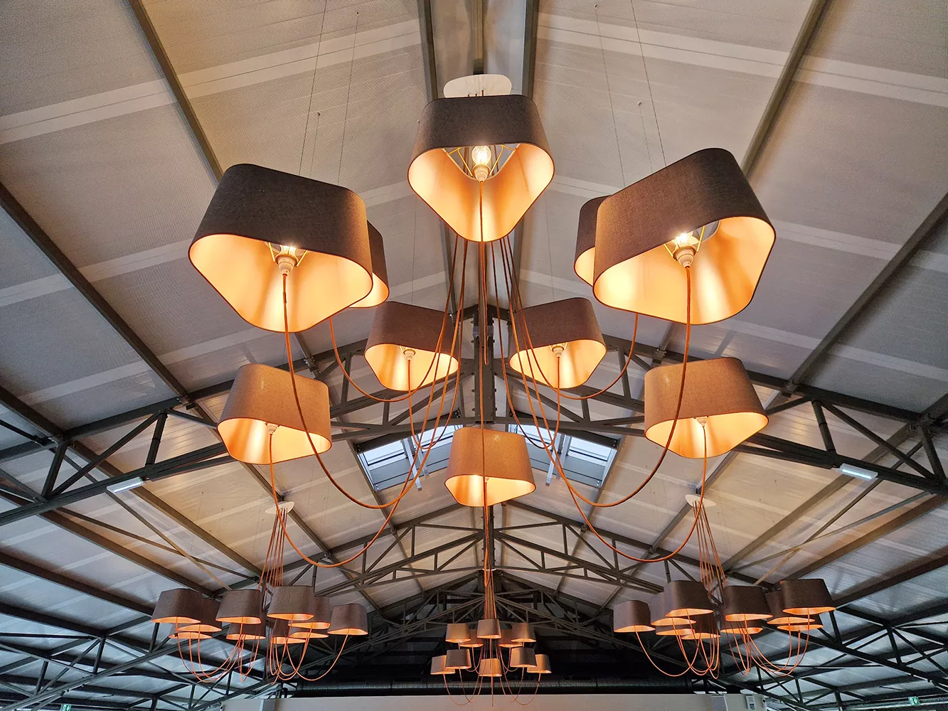 L'esprit moderne et féerique du lieu est entretenu par les 4 lustres 10 Grand Nuage cuivrés surplombant l'espace avec légèreté et élégance. Compte tenu de la pente du toit, deux des lustres ont été installés en couronne sur un seul niveau d'abat-jour. Ces luminaires baignent l'espace d'une lumière chaleureuse qui se reflète sur le sol en béton ciré, apportant un éclat des plus charmants.