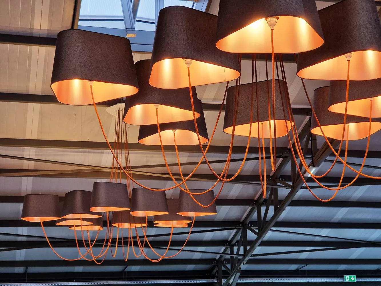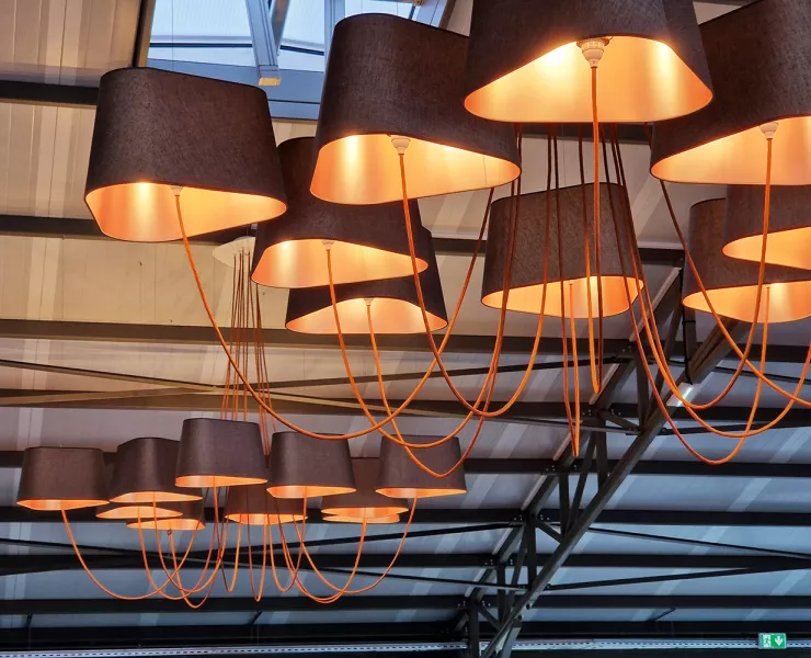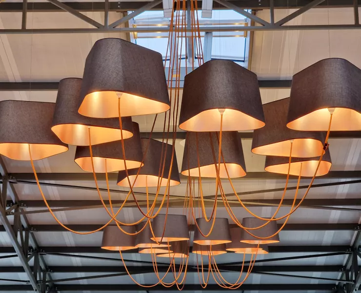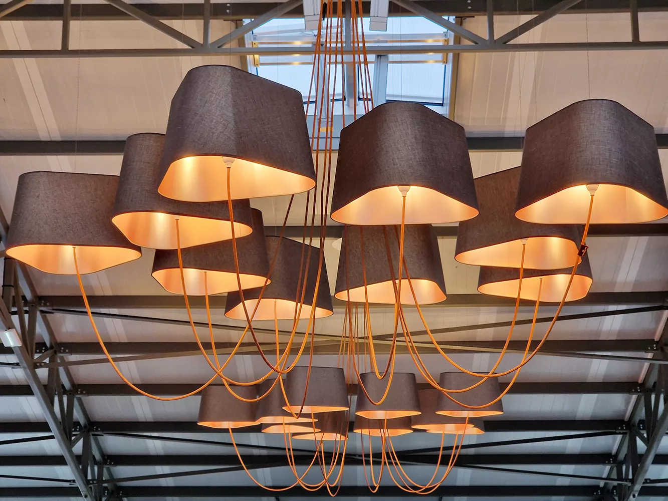 L'esprit moderne et féerique du lieu est entretenu par les 4 lustres 10 Grand Nuage cuivrés surplombant l'espace avec légèreté et élégance. Compte tenu de la pente du toit, deux des lustres ont été installés en couronne sur un seul niveau d'abat-jour. Ces luminaires baignent l'espace d'une lumière chaleureuse qui se reflète sur le sol en béton ciré, apportant un éclat des plus charmants.