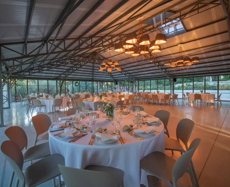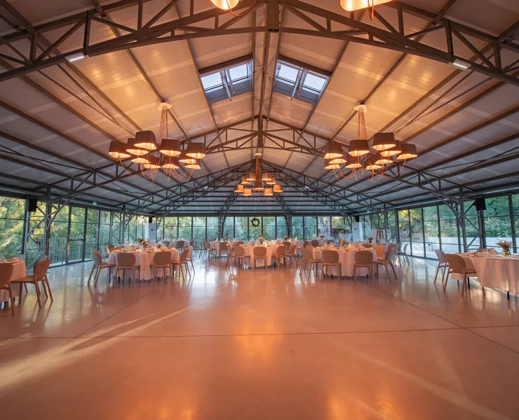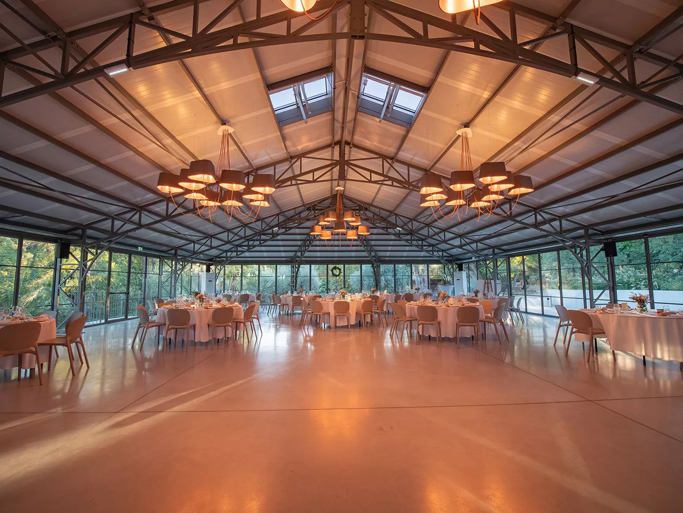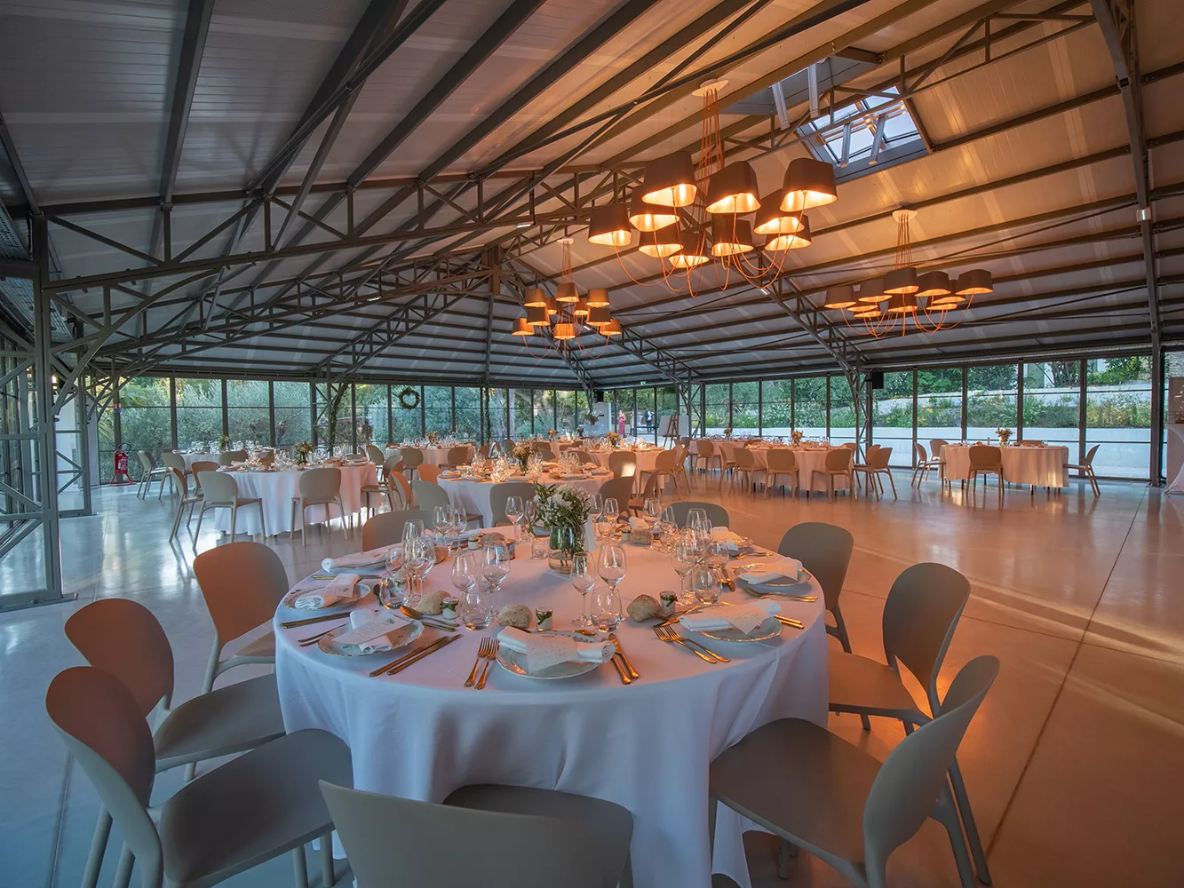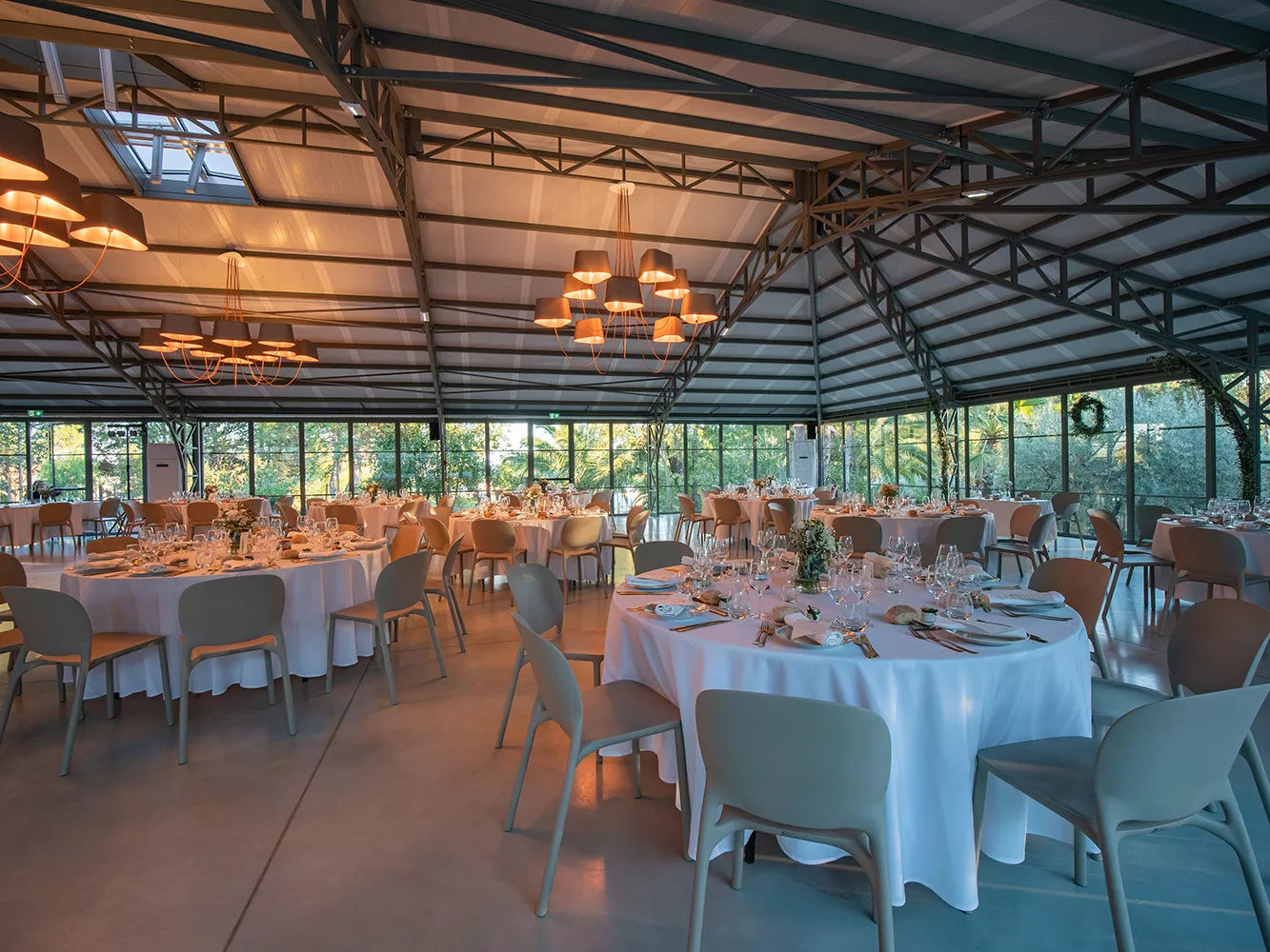 L'Orangerie du Mas Aubrilha offre un espace de réception singulier, dont l'architecture vitrée s'allie harmonieusement avec le métal, permettant de créer un espace ouvert sur le parc centenaire de 6 hectares.