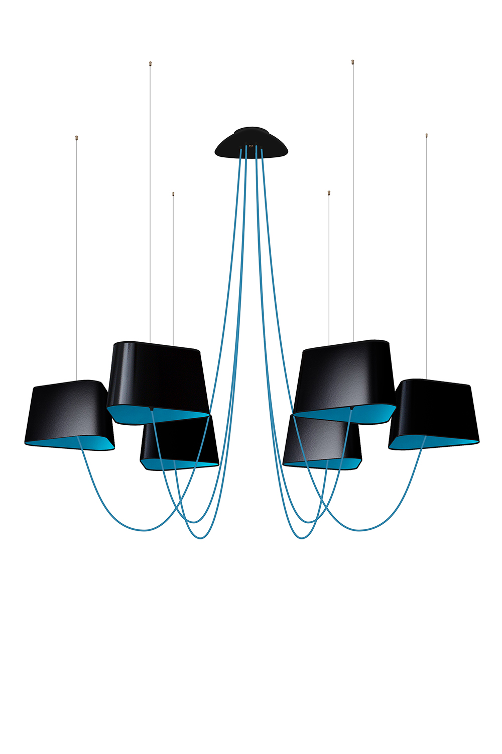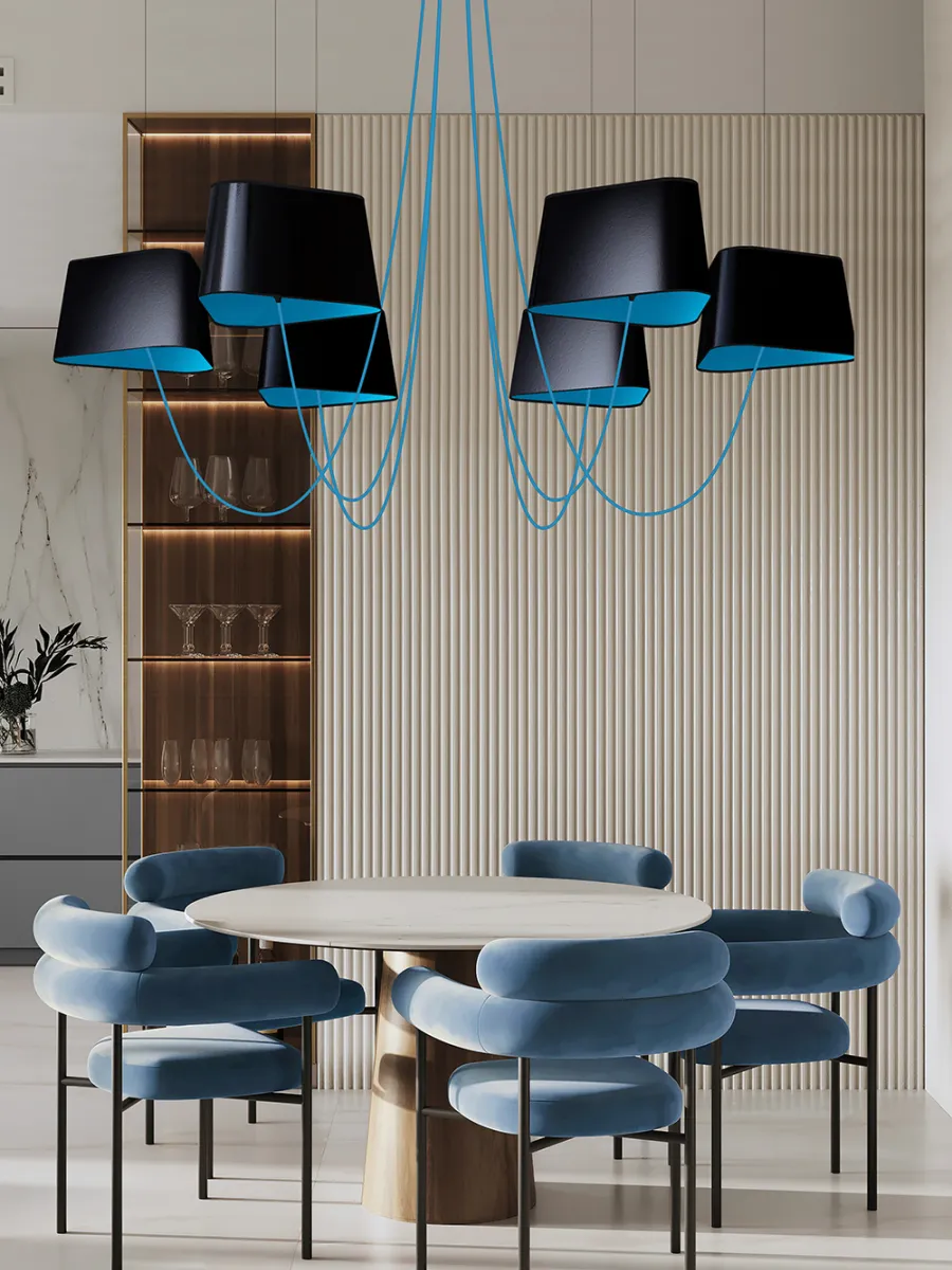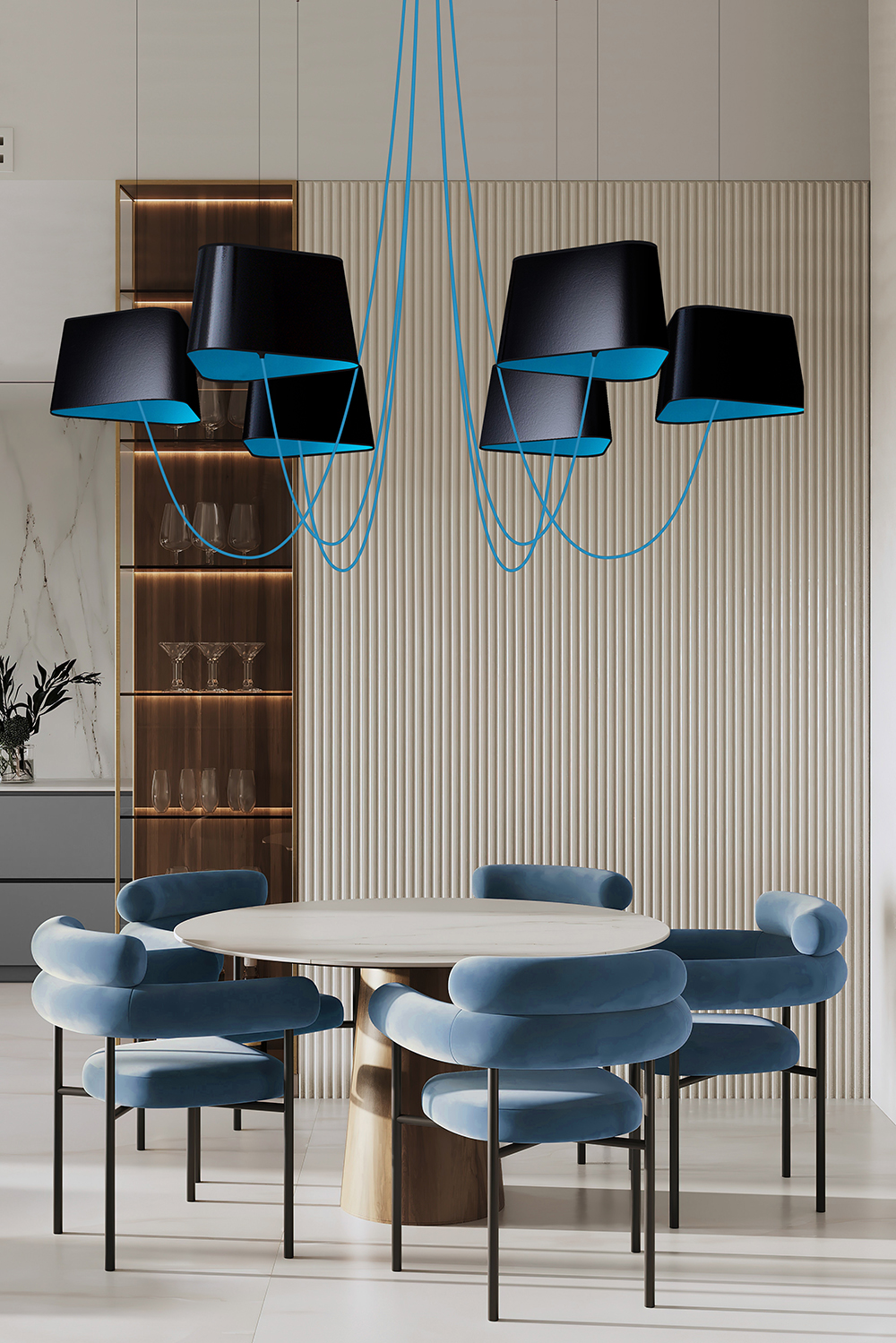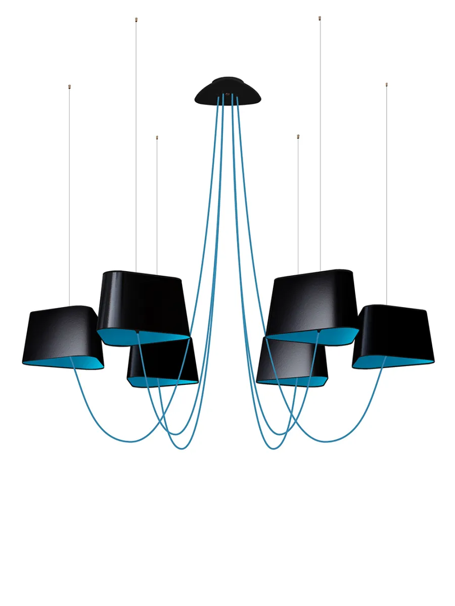 Ce magnifique lustre aérien semble flotter dans les airs grâce à son esprit nomade et poétique. Les abat-jours triangulaires et arrondis de la collection Nuage s’apparentent à la proue d’un bateau avec un design intemporel et universel. Modulable, ce lustre est réglable en hauteur et en diamètre : Fixés sur des câbles en acier, les abat-jours peuvent être montés ou descendus grâce à un piston situé sur leur partie supérieure. Notre atelier ajuste les longueurs de câble et de fil selon les dimensions de votre intérieur, pour vous fabriquer un lustre sur-mesure prêt à poser. Il se compose de 6 grands abat-jours noir laqué à l’extérieur et tissu bleu à l’intérieur, chacun alimentés par des cordons en textile bleu décoratifs montés sur une patère noire. Son éclairage apporte une lumière bien particulière, découpant l’espace de façon architecturale.