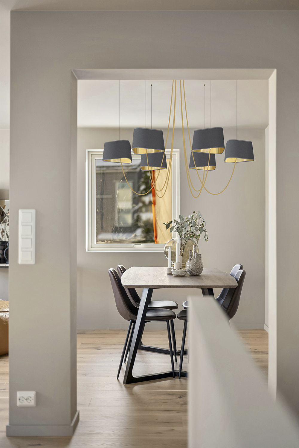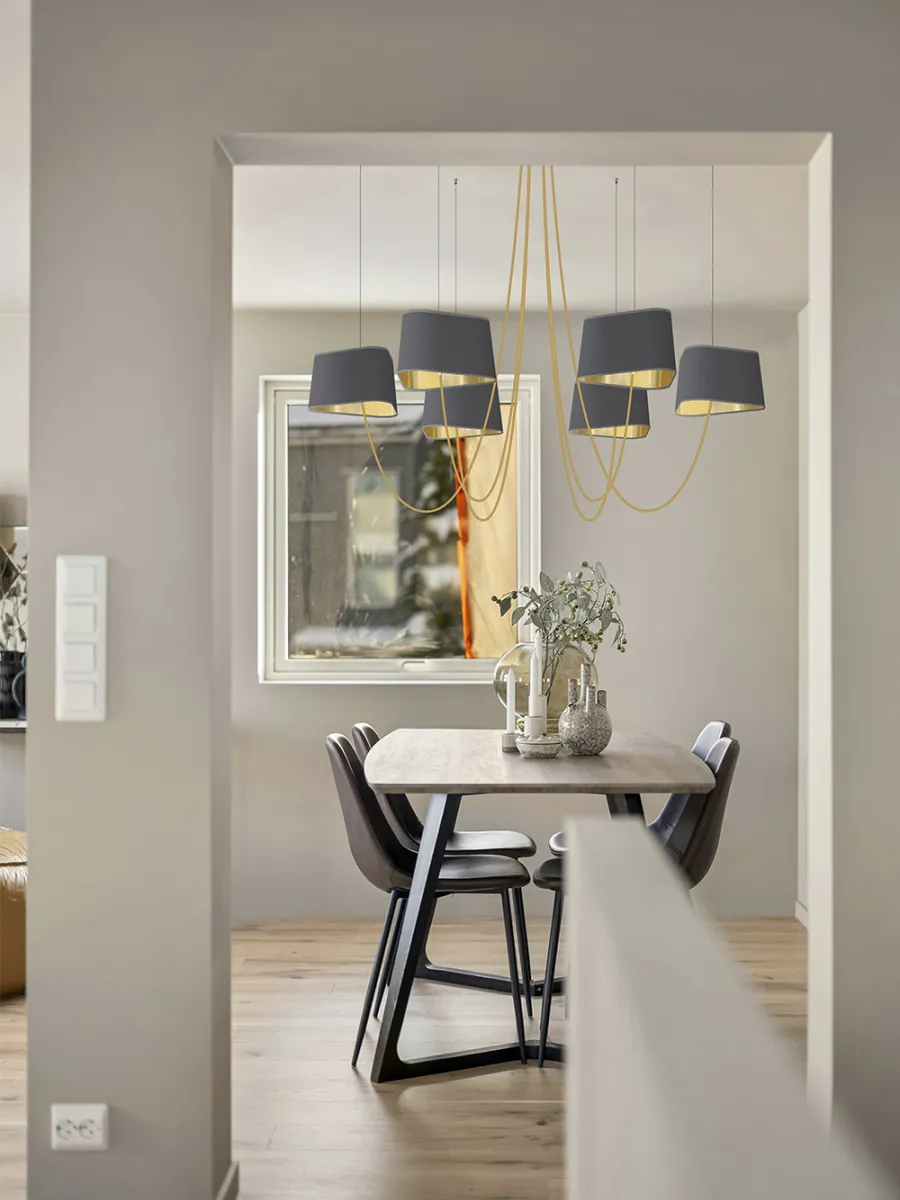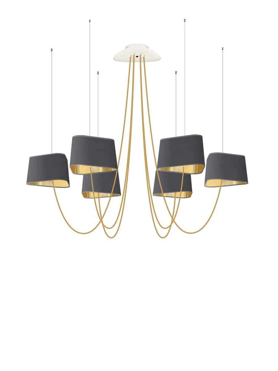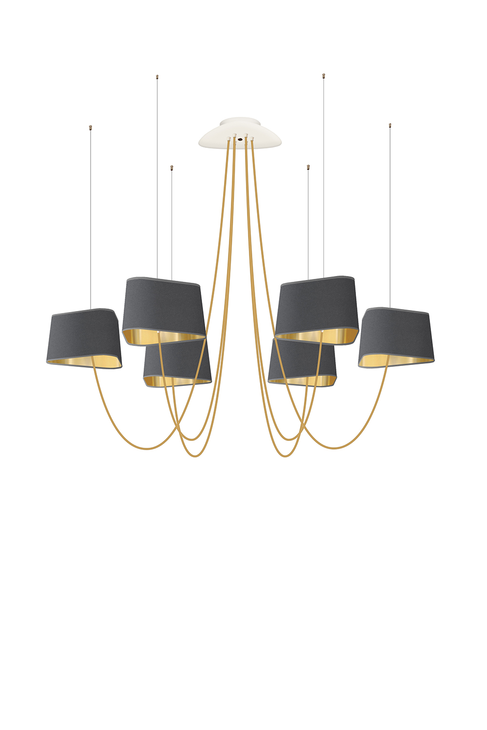 Il se compose de 6 abat-jours de taille moyenne en tissu gris à l’extérieur et doré à l’intérieur, chacun alimentés par des cordons en textile doré décoratifs montés sur une patère blanche. Son éclairage apporte une lumière bien particulière, découpant l’espace de façon architecturale.