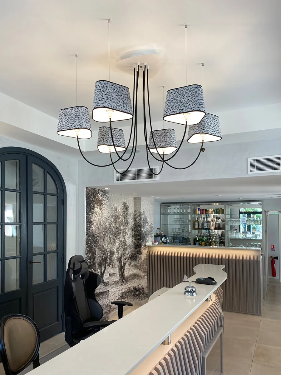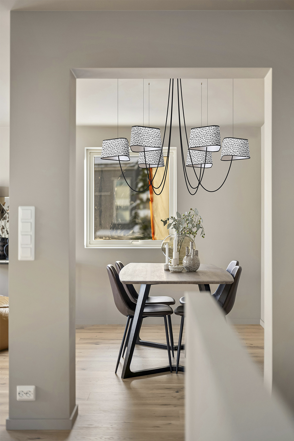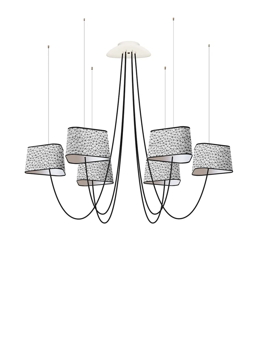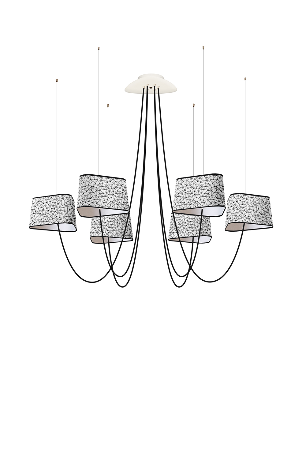 Il se compose de 6 abat-jours de taille moyenne en tissu blanc à motifs noirs à l’extérieur et blanc à l’intérieur, chacun alimentés par des cordons en textile doré décoratifs montés sur une patère blanche. Son éclairage apporte une lumière bien particulière, découpant l’espace de façon architecturale.