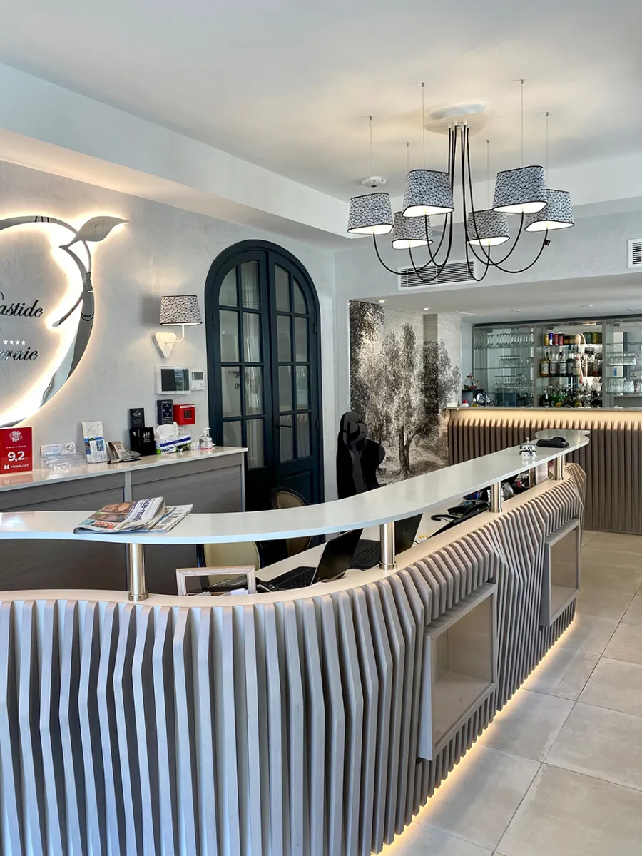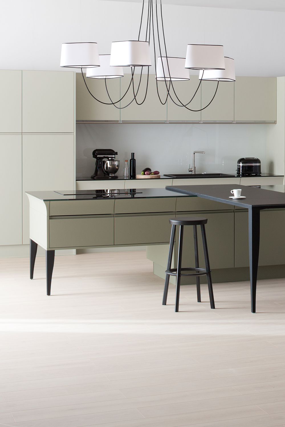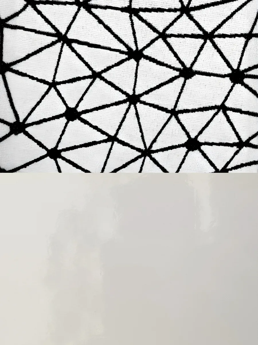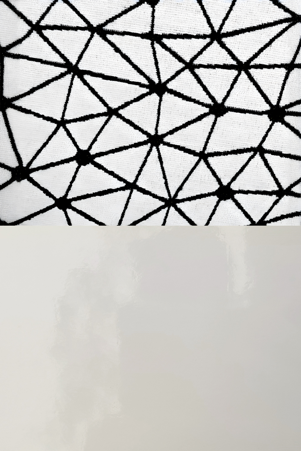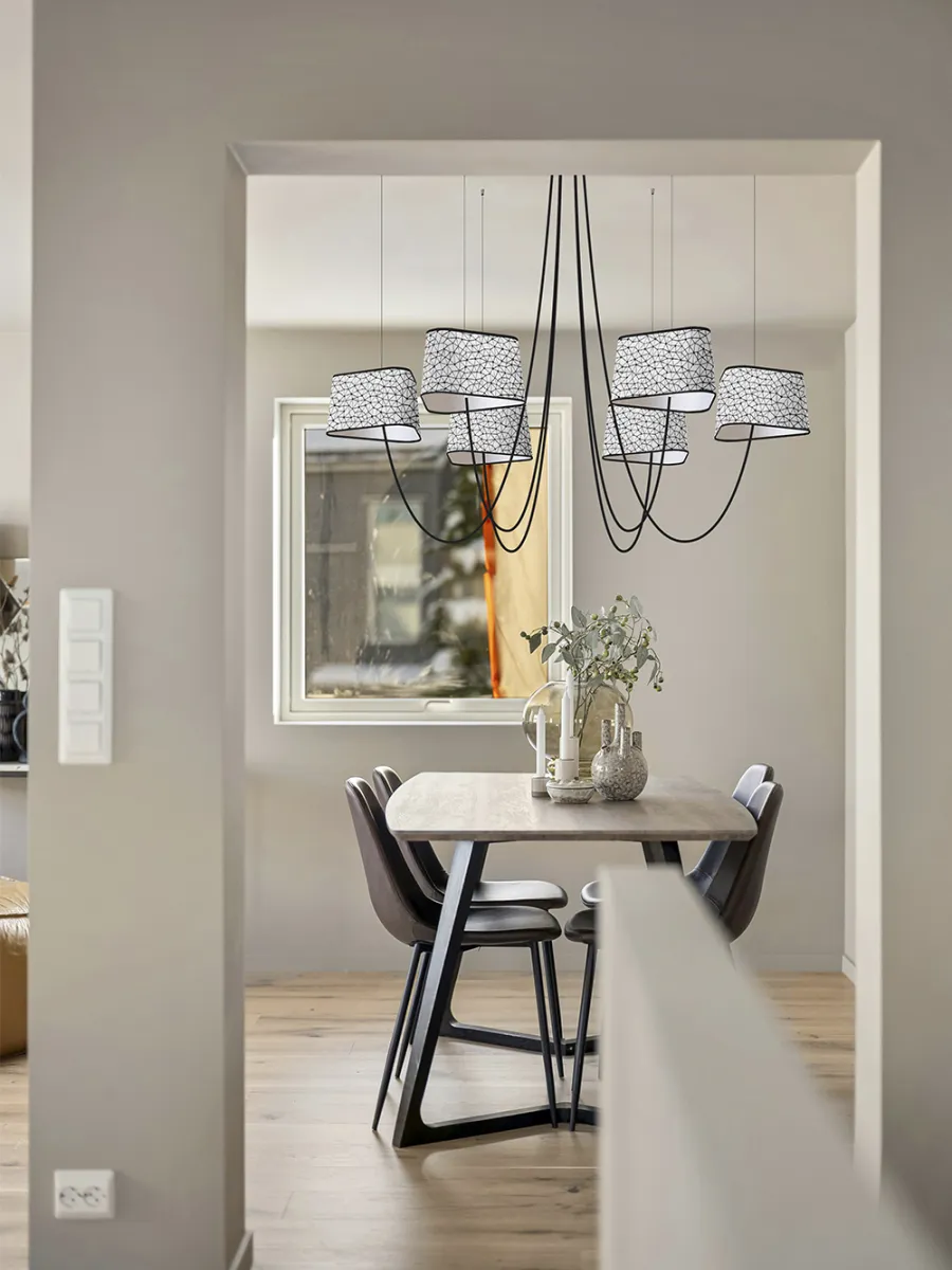Il se compose de 6 abat-jours de taille moyenne en tissu blanc à motifs noirs à l’extérieur et blanc à l’intérieur, chacun alimentés par des cordons en textile doré décoratifs montés sur une patère blanche. Son éclairage apporte une lumière bien particulière, découpant l’espace de façon architecturale.