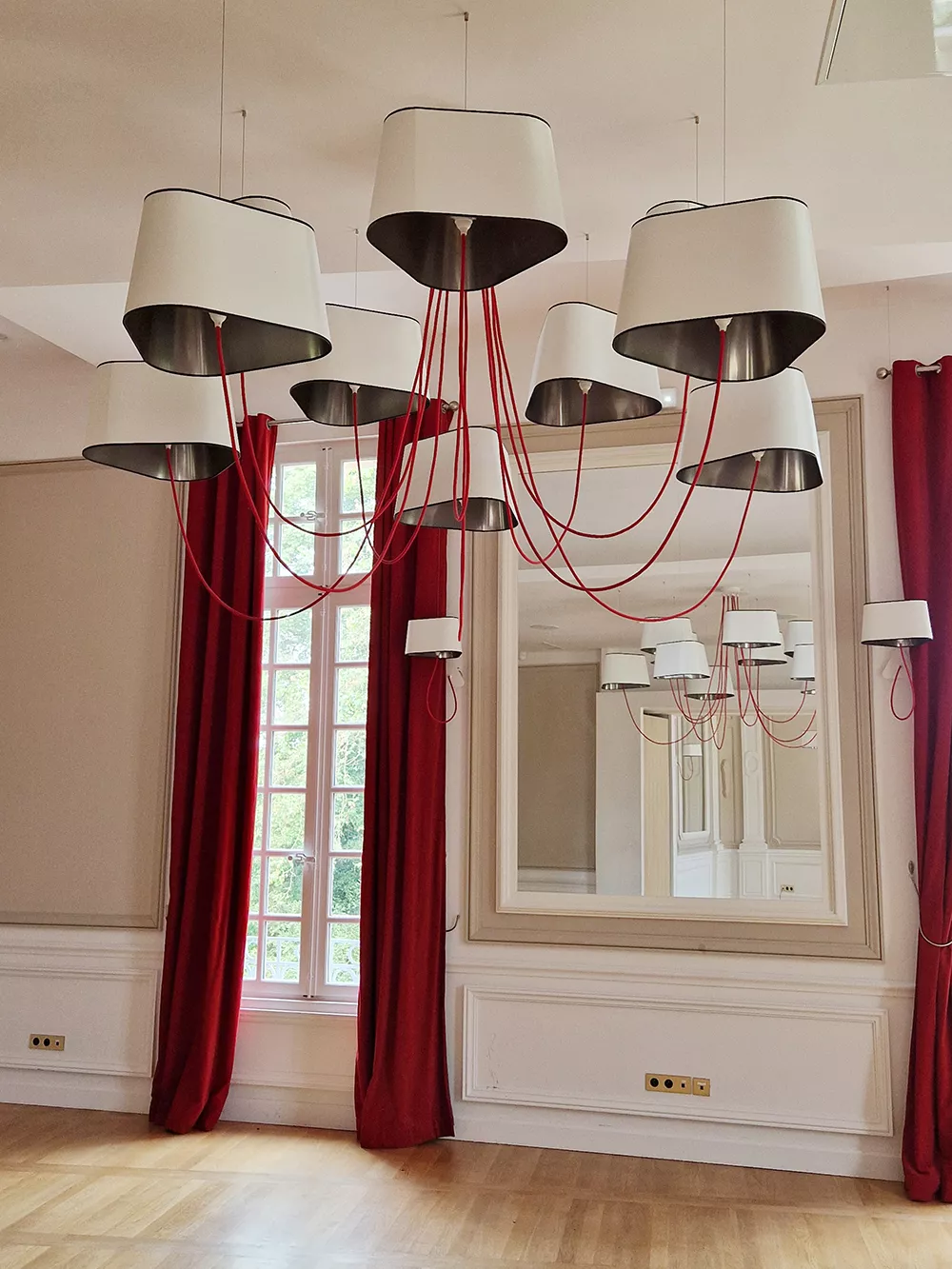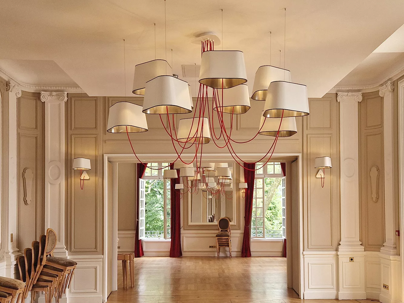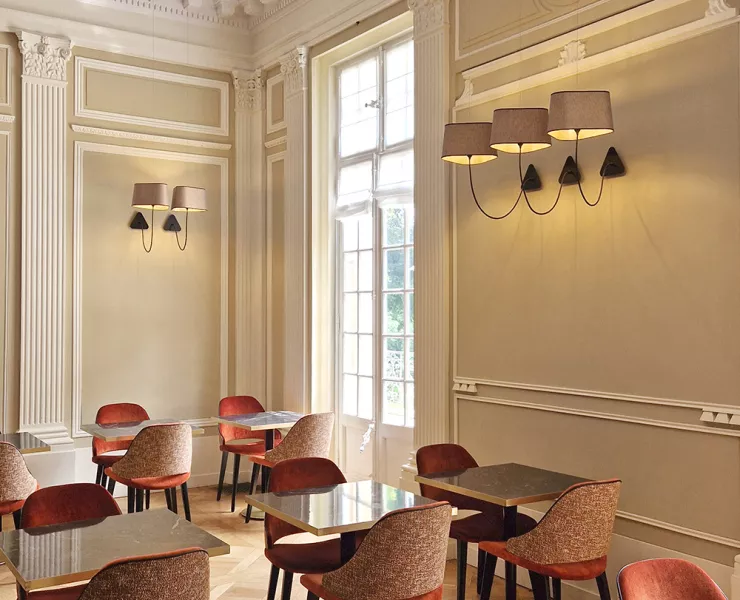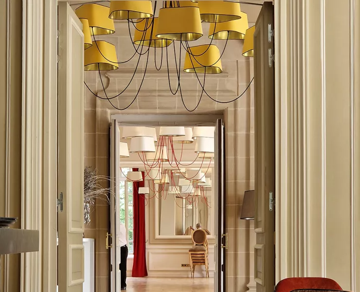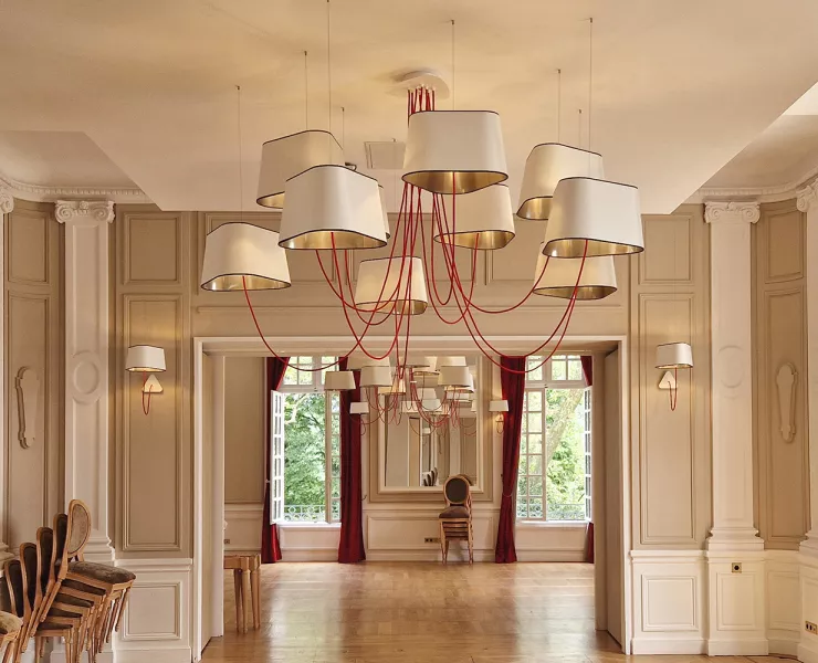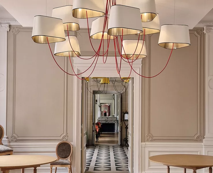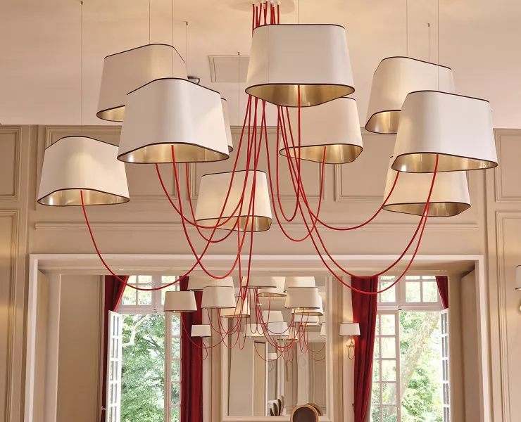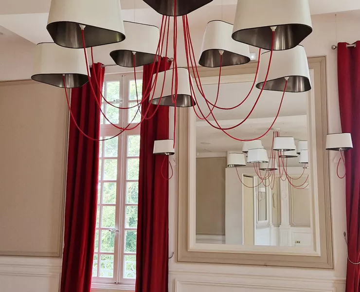 The decoration of the property combines the historic and majestic dimensions of the place with a modern and comfortable layout that adopts the classic codes of a chateau: The Nuage collection, with its rounded triangular shades, reinterprets the historic shape of forged chandeliers but uses lighter materials such as fabric and its electric textile cords to give it an aerial line.