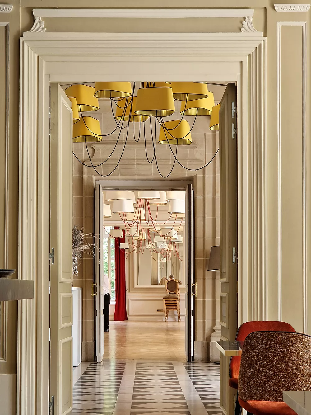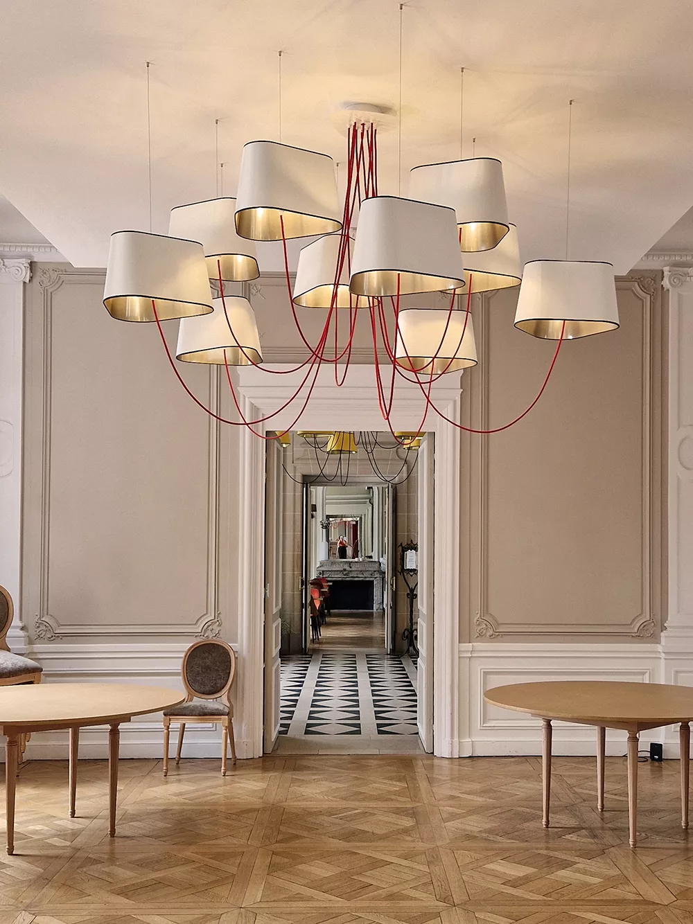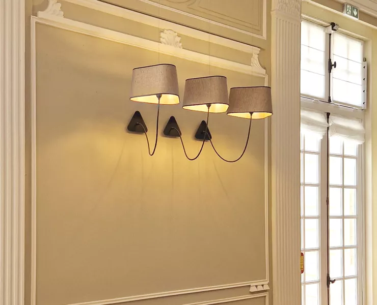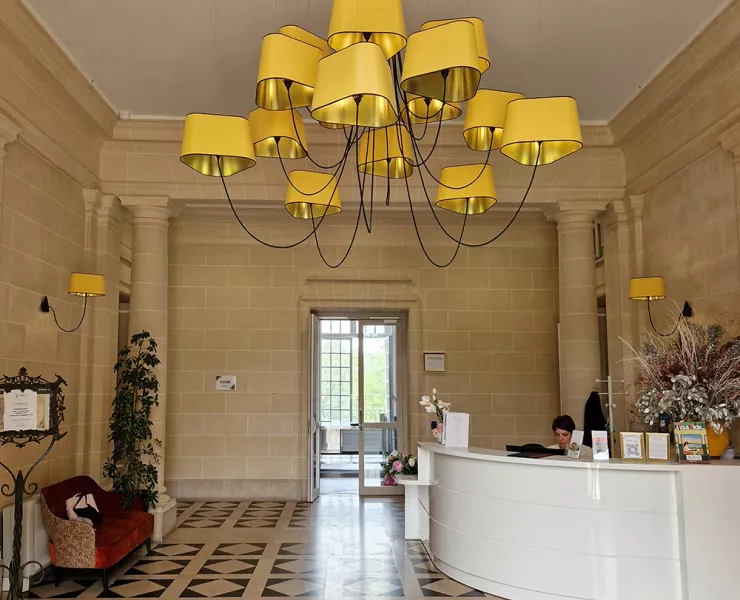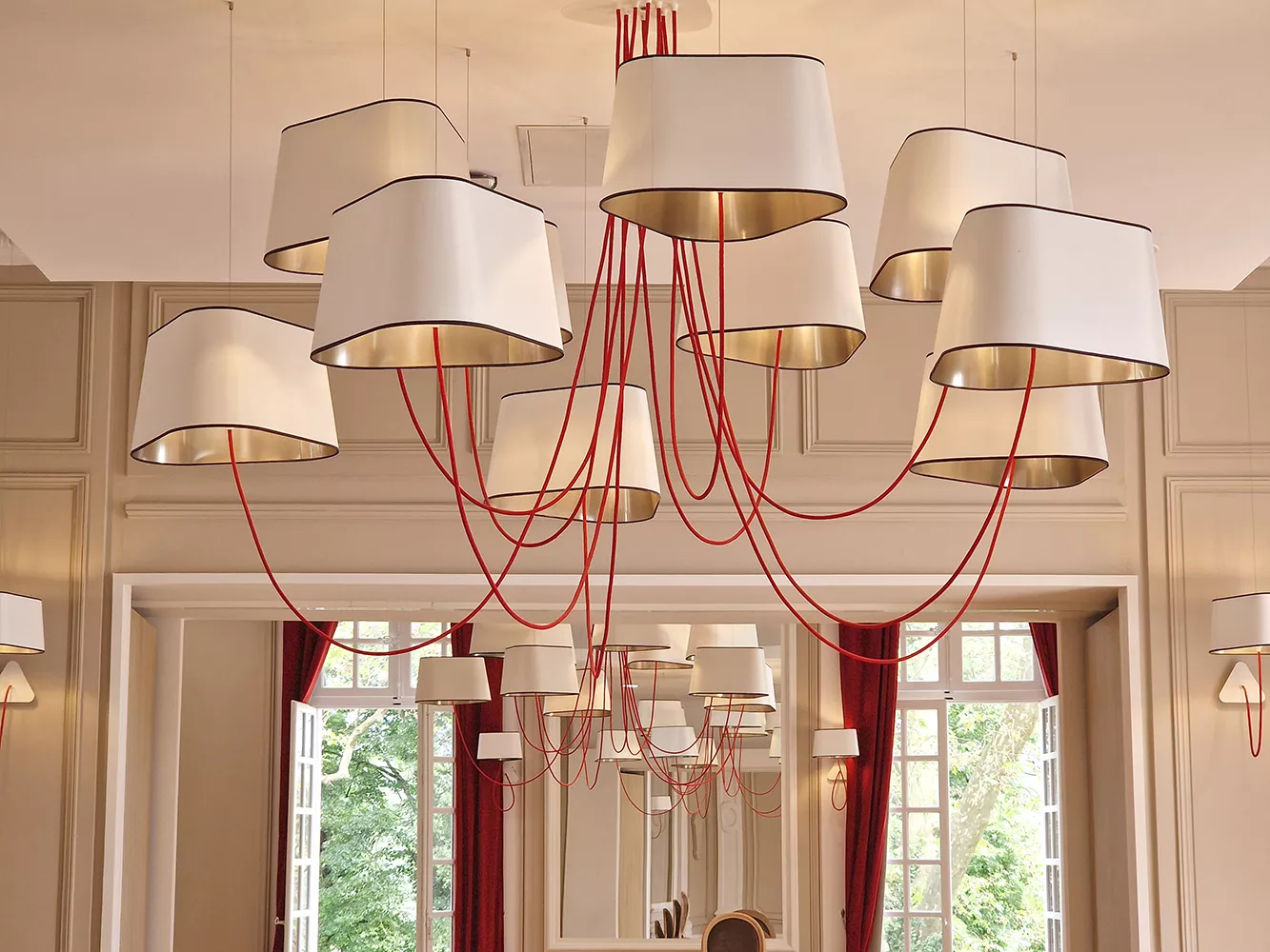 The decoration of the property combines the historic and majestic dimensions of the place with a modern and comfortable layout that adopts the classic codes of a chateau: The Nuage collection, with its rounded triangular shades, reinterprets the historic shape of forged chandeliers but uses lighter materials such as fabric and its electric textile cords to give it an aerial line.