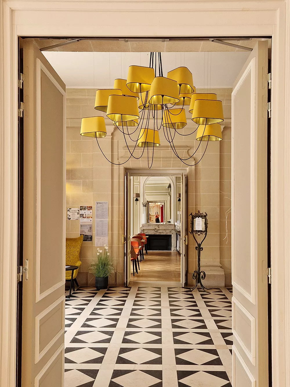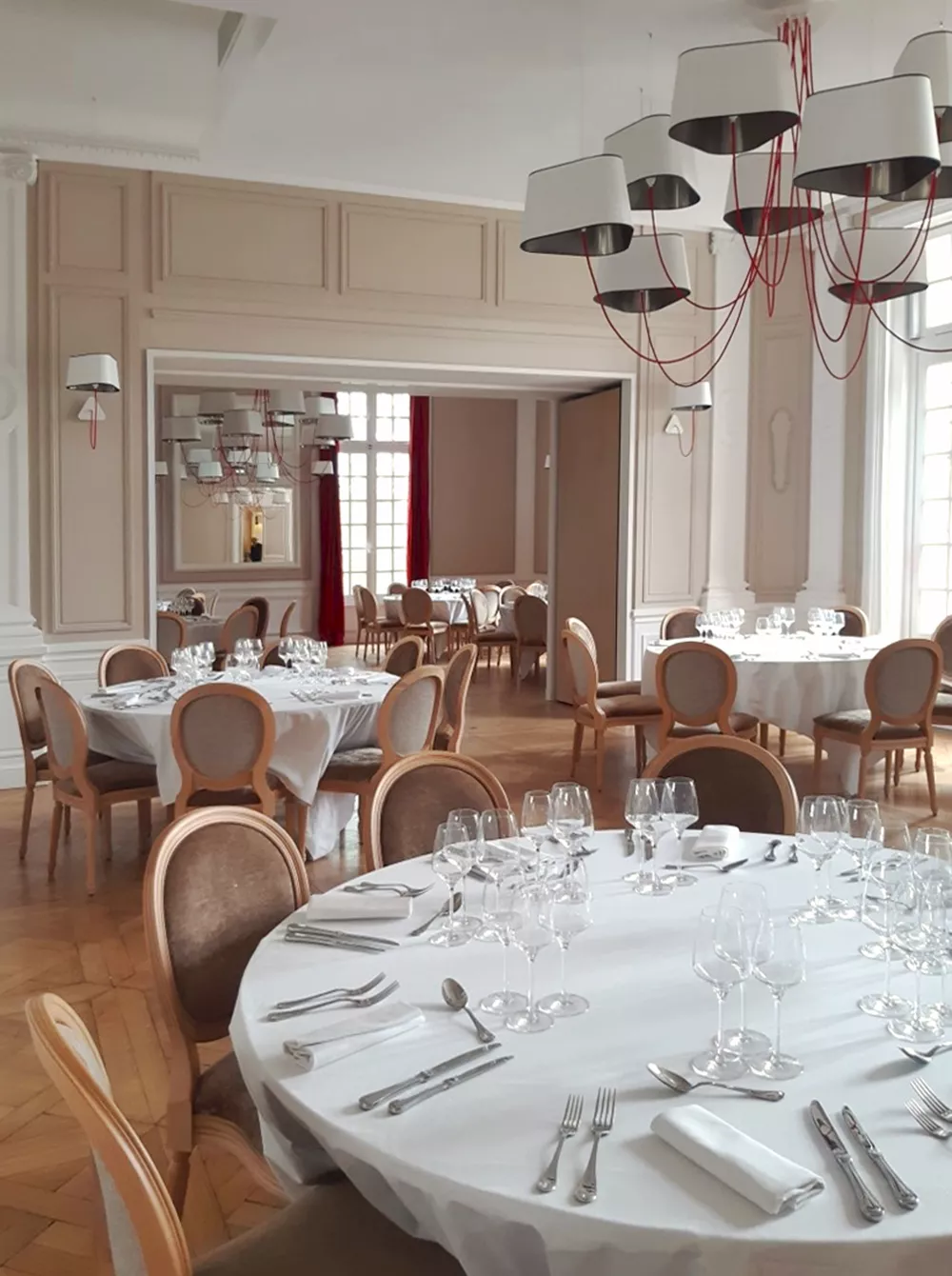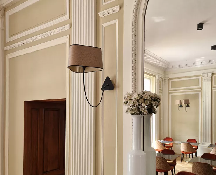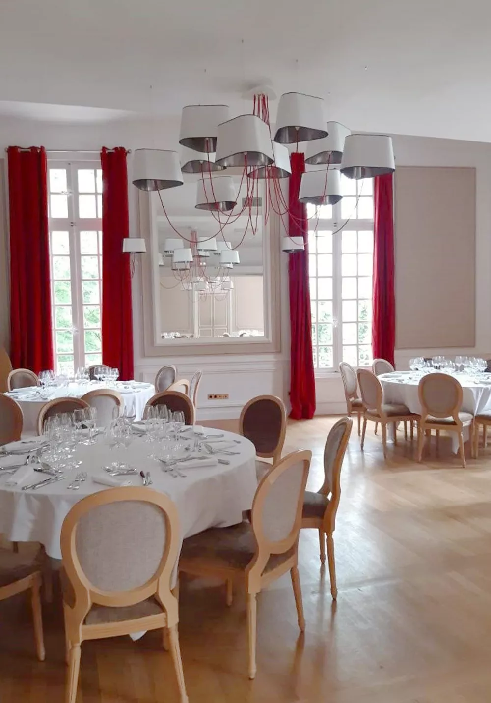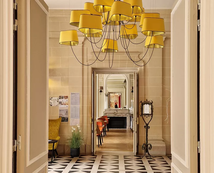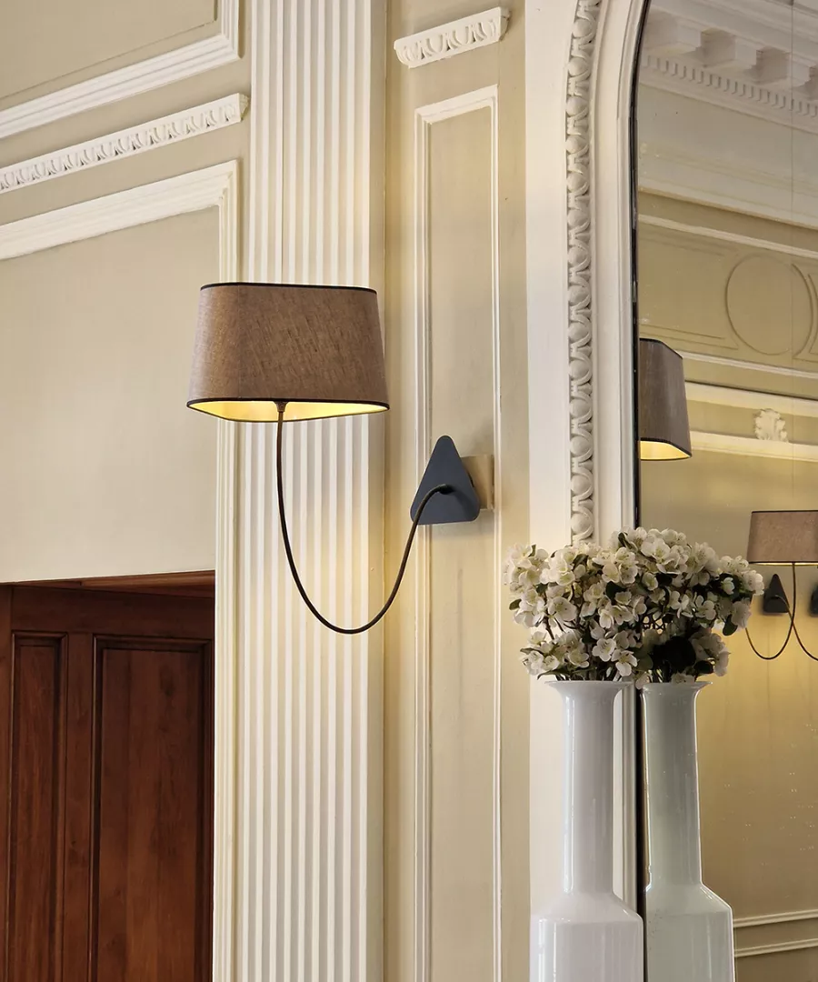 The decoration of the property combines the historic and majestic dimensions of the place with a modern and comfortable layout that adopts the classic codes of a chateau: The Nuage collection, with its rounded triangular shades, reinterprets the historic shape of forged chandeliers but uses lighter materials such as fabric and its electric textile cords to give it an aerial line.
