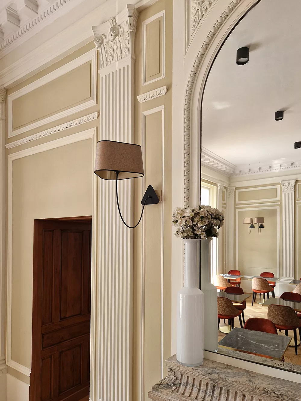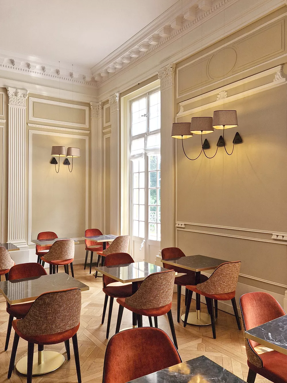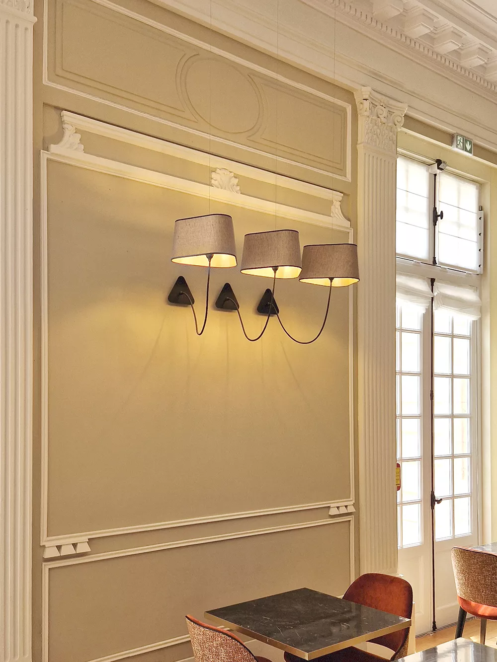 The Arômes Bar is beautifully lit with numerous Moyen Nuage suspended wall lamps with metallic copper fabric shades and pinkish copper interiors. This standard finish provides a warm glow that perfectly complements the fabrics of the Nog chairs from Collinet.