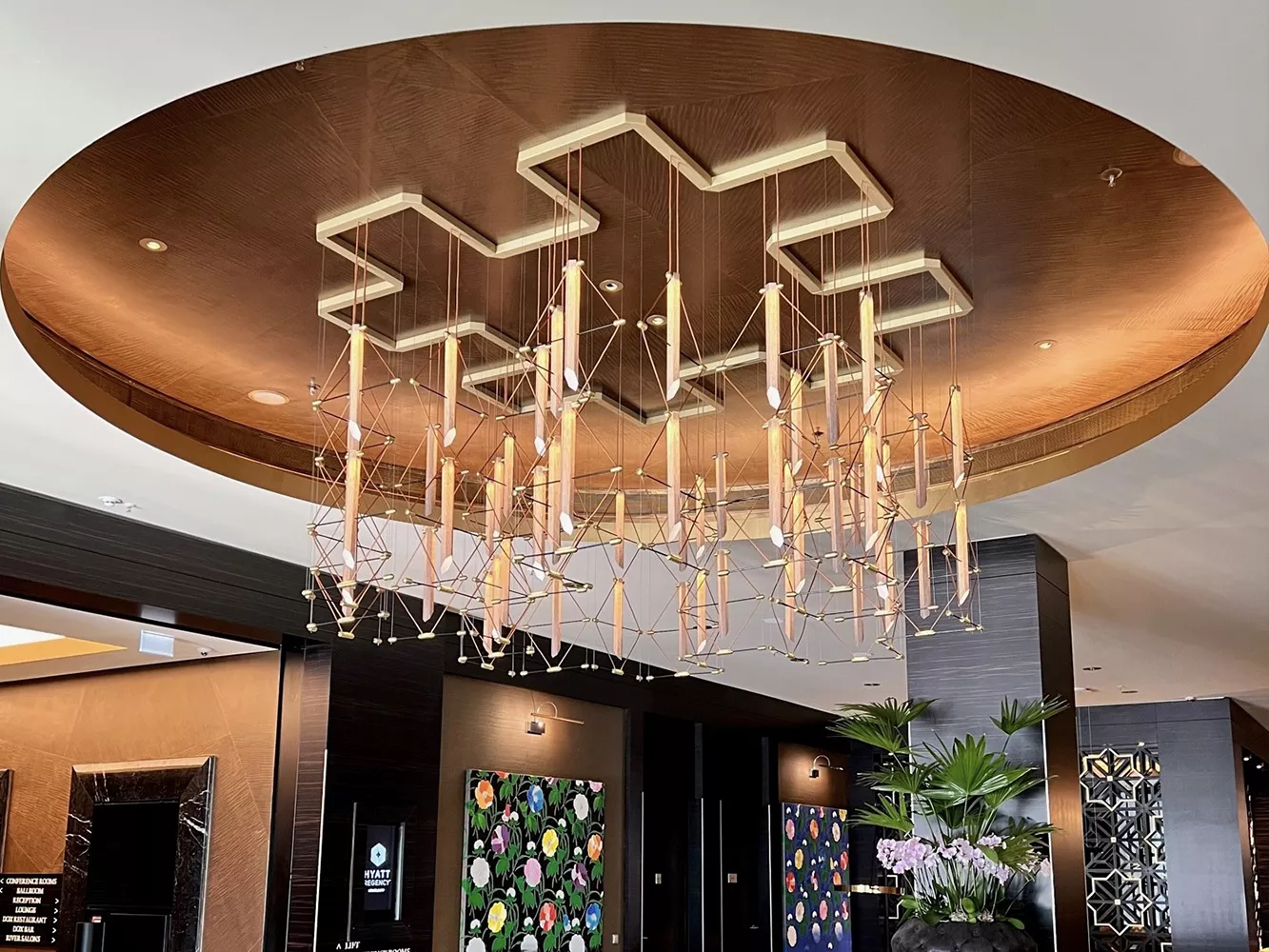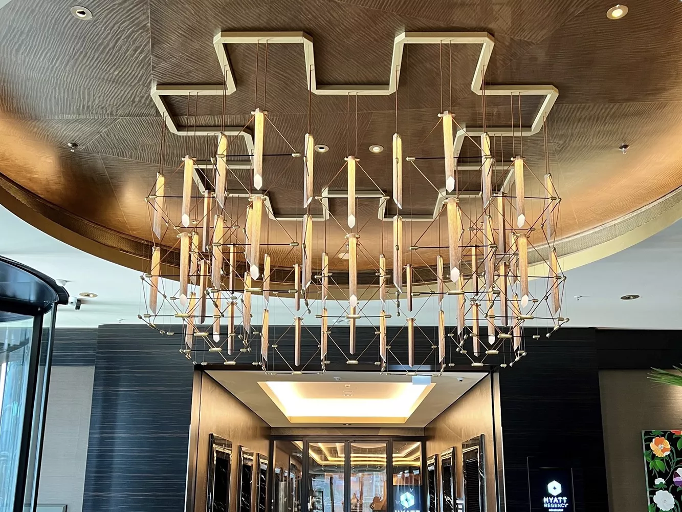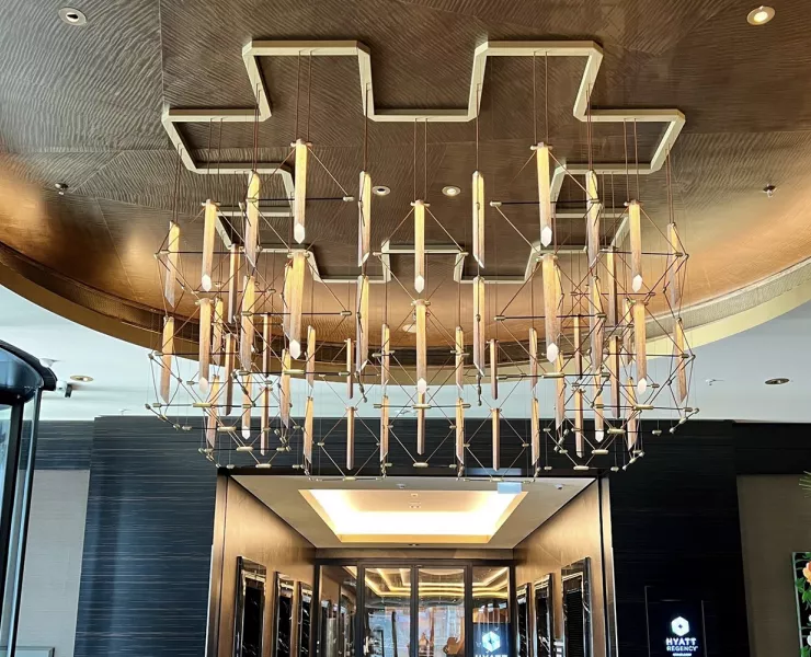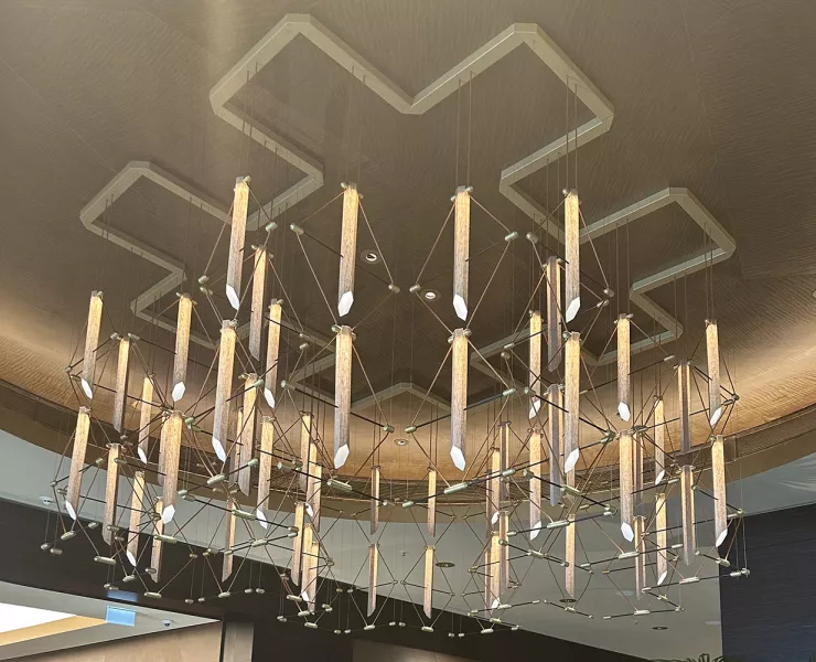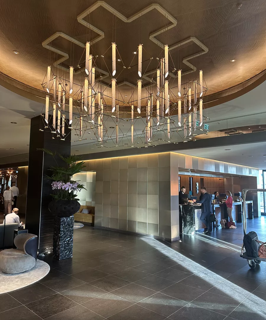 The MOZAIK chandelier soars above the hotel lobby and, visible from afar, invites visitors to enter this elegant and luxurious lobby.