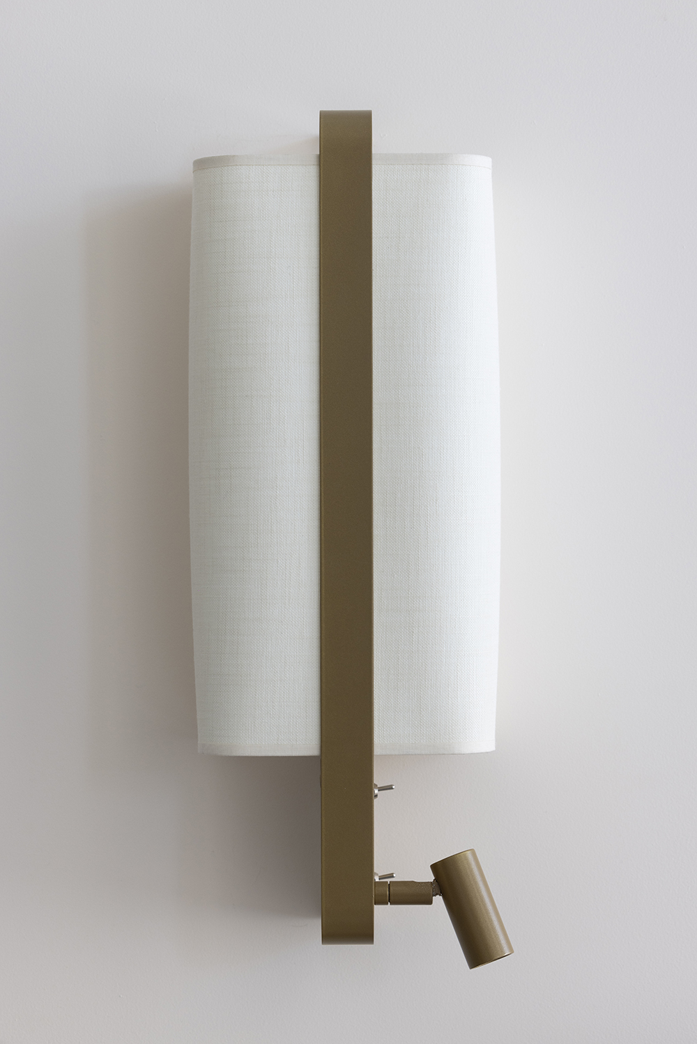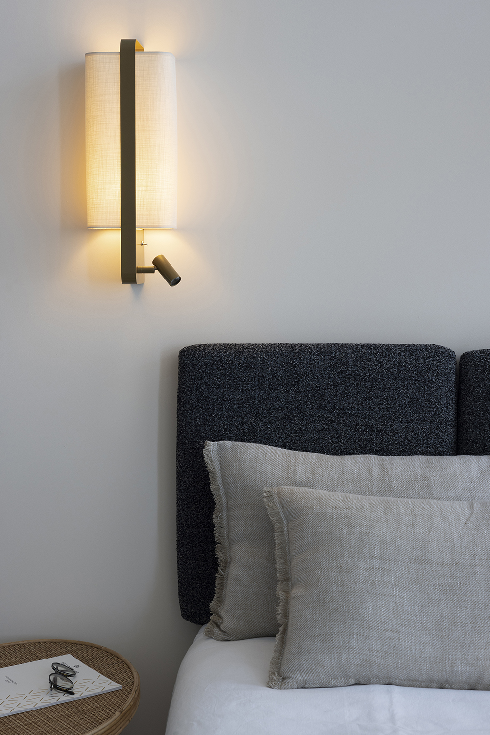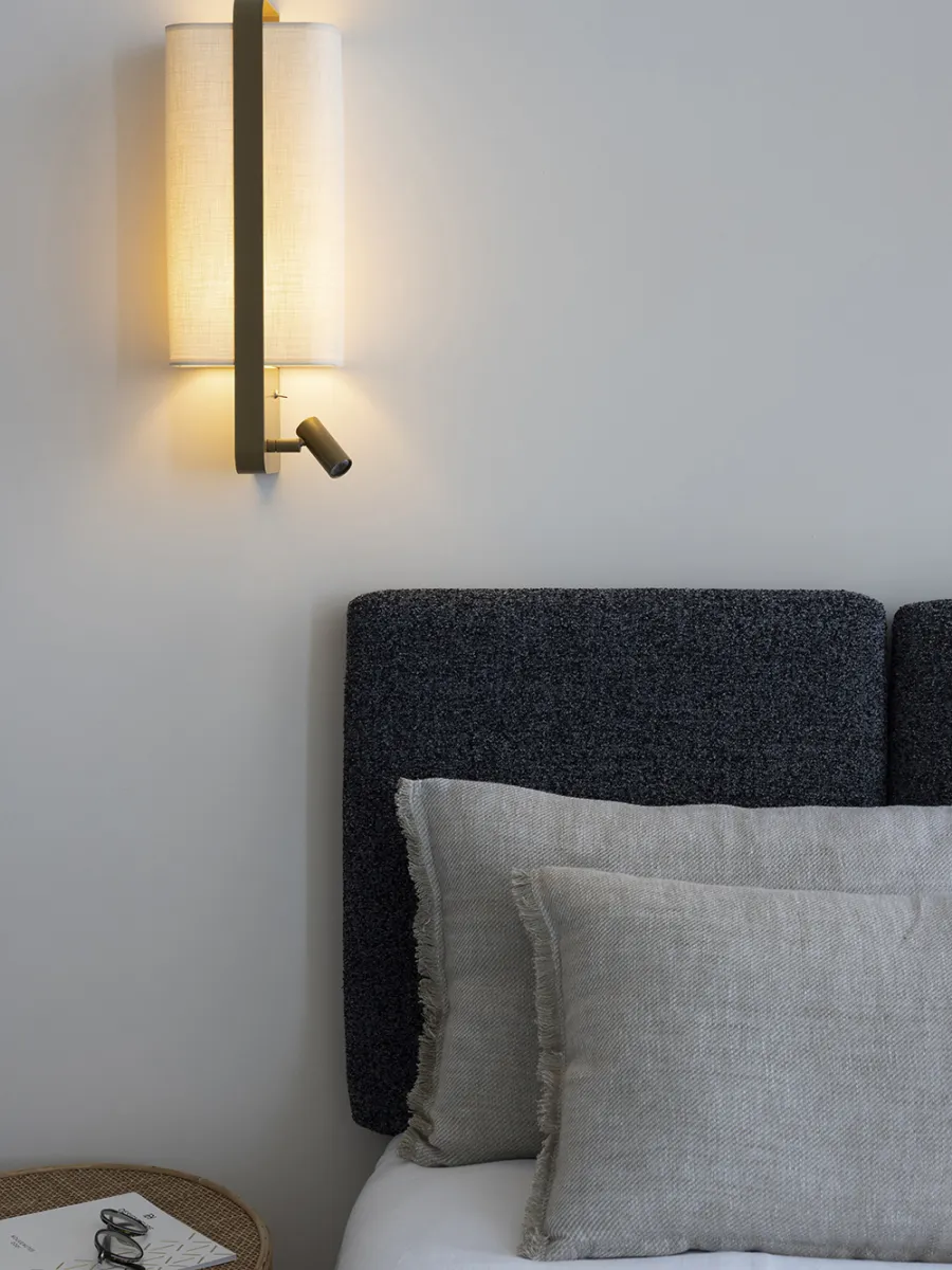 With its innovative and elegant edge-mounting system, this left bedside wall light is an undeniable addition to the lighting market. Ideal for use at the head of a bed, the LED spot version has a reading light that can be adjusted both laterally and vertically, and a double switch system discreetly positioned on the user's side. The LED spotlight and lampshade can be switched on together or independently for comfortable reading. Also available in a suspended version without reading light.