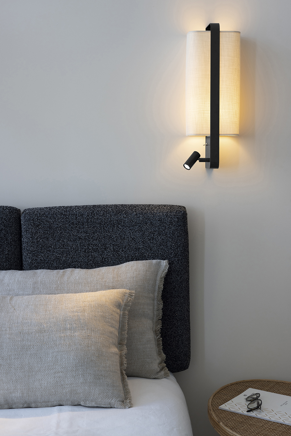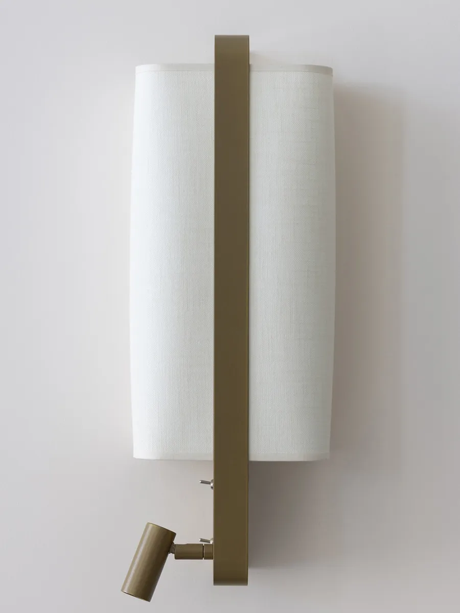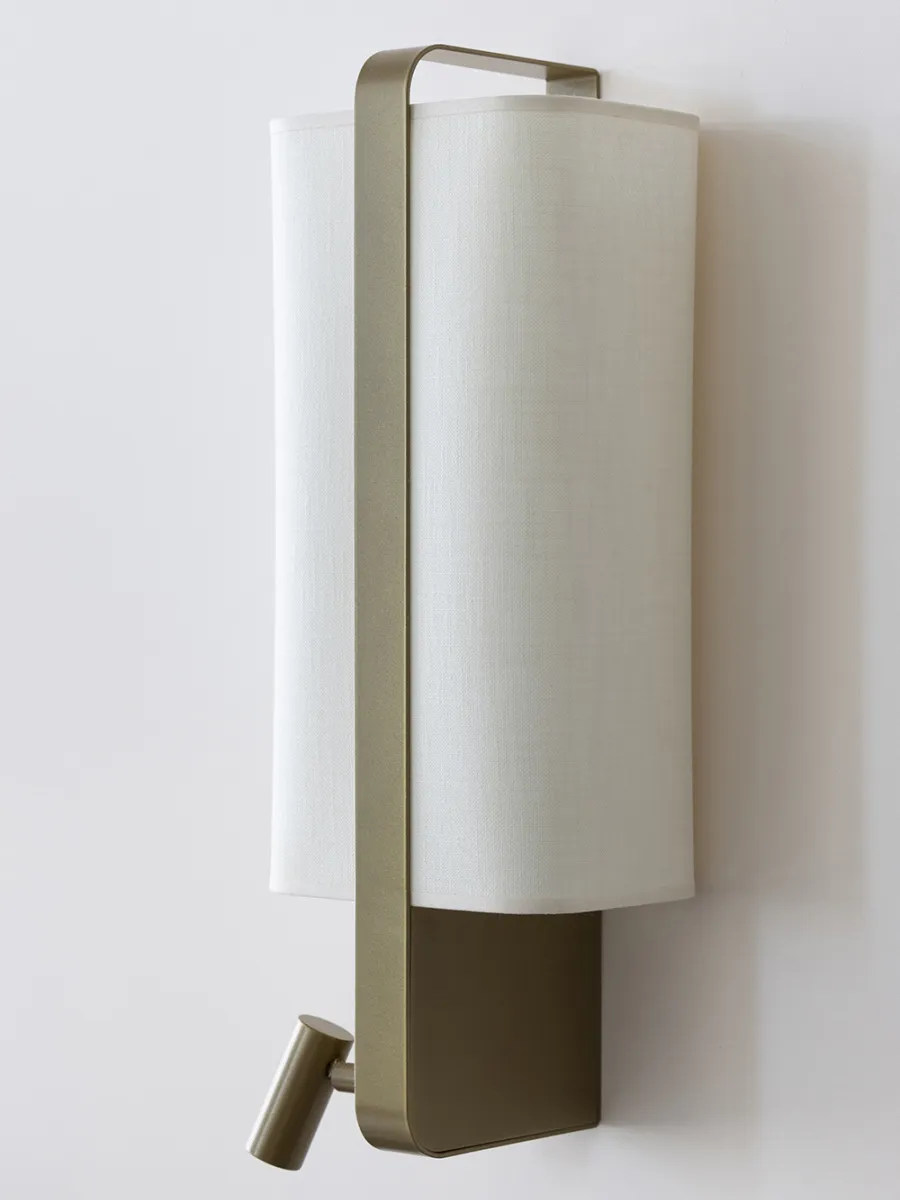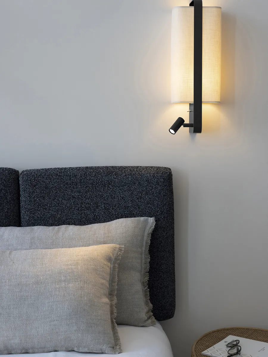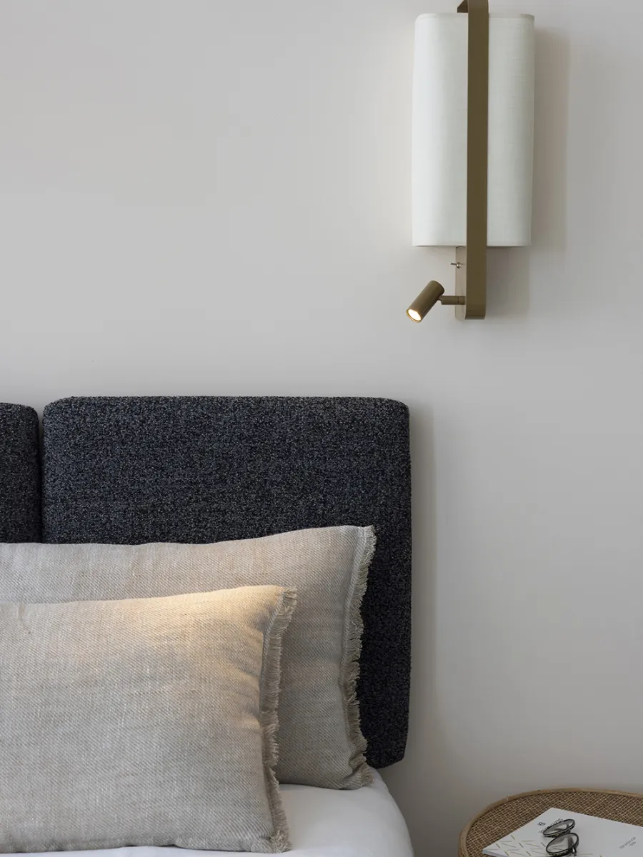 With its innovative and elegant edge-mounting system, this right bedside wall light is an undeniable addition to the lighting market. Ideal for use at the head of a bed, the LED spot version has a reading light that can be adjusted both laterally and vertically, and a double switch system discreetly positioned on the user's side (Left and Right versions). The LED spotlight and lampshade can be switched on together or independently for comfortable reading. Also available in a suspended version without reading light.