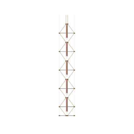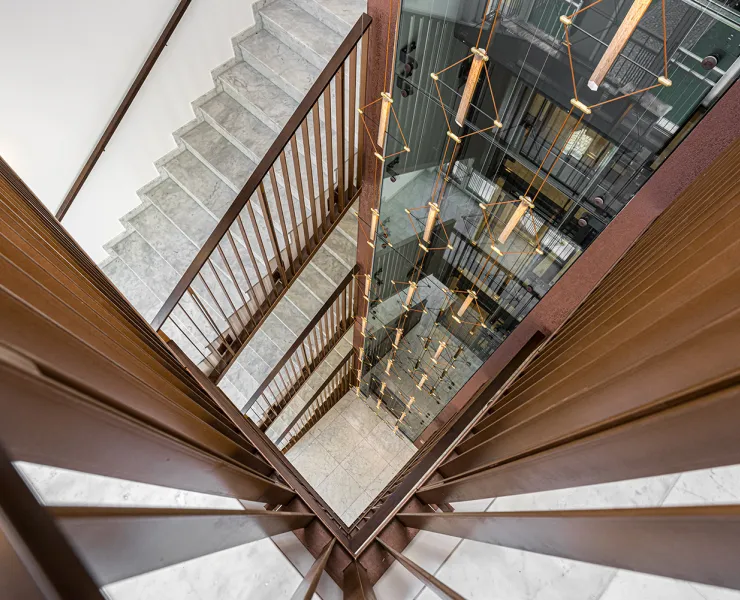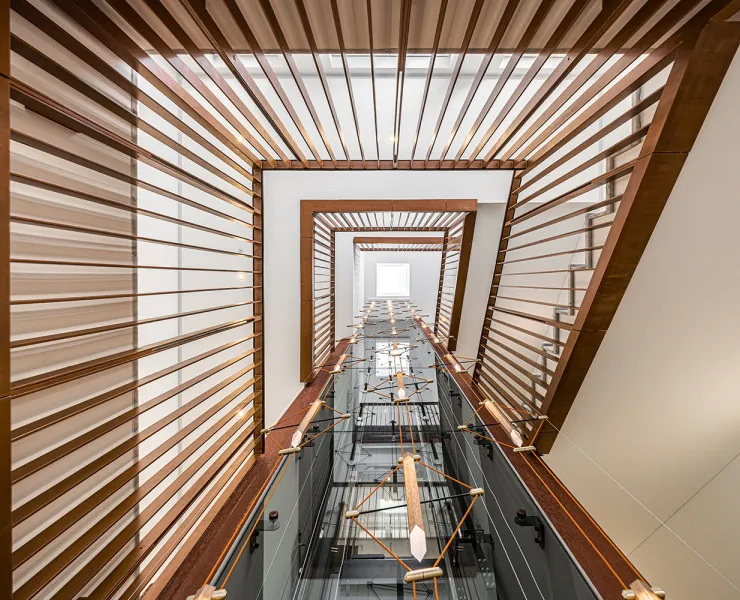 With a subtle yet richly detailed aesthetic, the installation combines craftsmanship with refined materials. The copper-toned lampshade fabrics and textile cords, forming diamond-shaped modules, echo the colour palette of the interiors and reinforce the feeling of luxury on the landings and staircases. The light points, carefully positioned over the entire height of the void, create a visual rhythm that can be perceived on all four levels. The passage of the glass lift throughout the height of the installation offers residents and visitors an immersive experience, making the chandelier the centrepiece of the architecture.