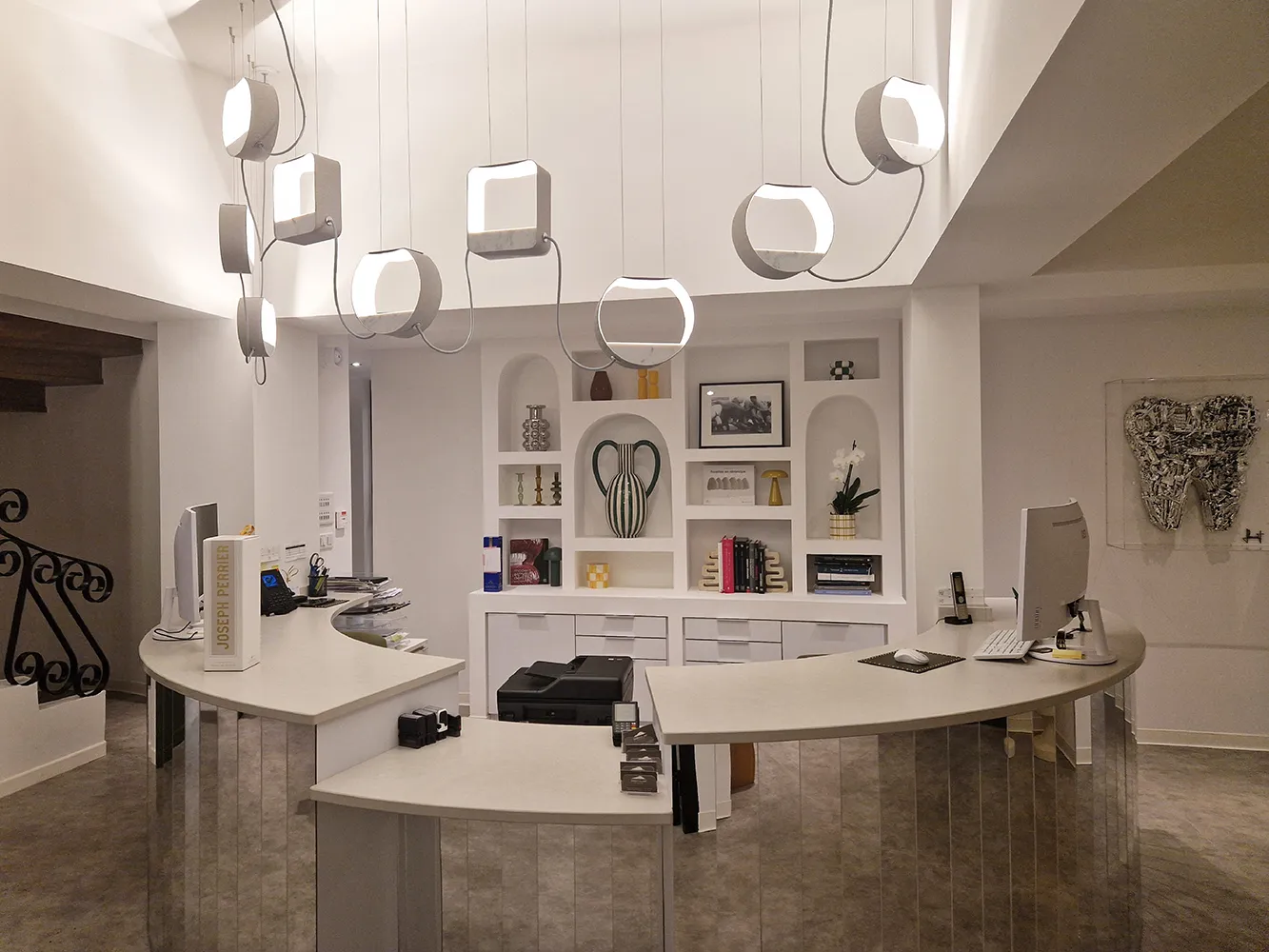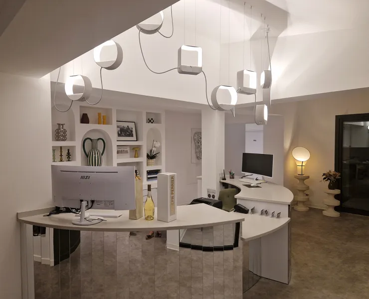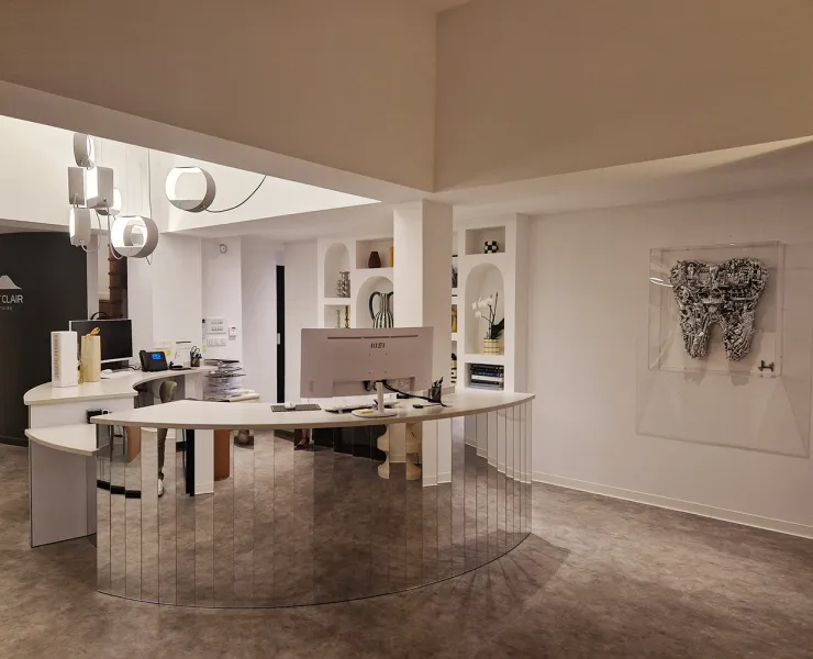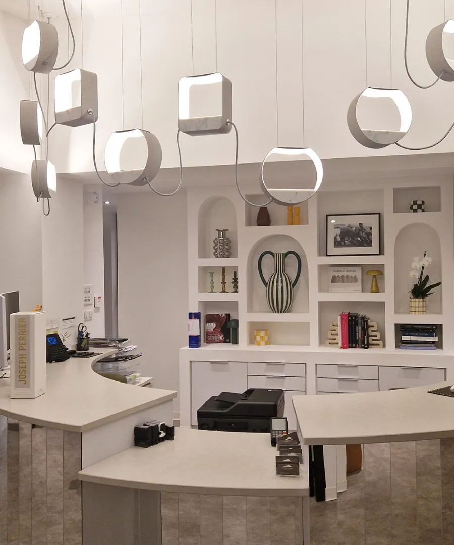 The Saint Clair Dentaire dental practice is illuminated by DESIGNHEURE pendant lights, designed and manufactured in our workshops in Sète. This project is particularly close to our hearts, as the practice is located in the same town as our head office, reinforcing the link between our craftsmanship and its local environment.