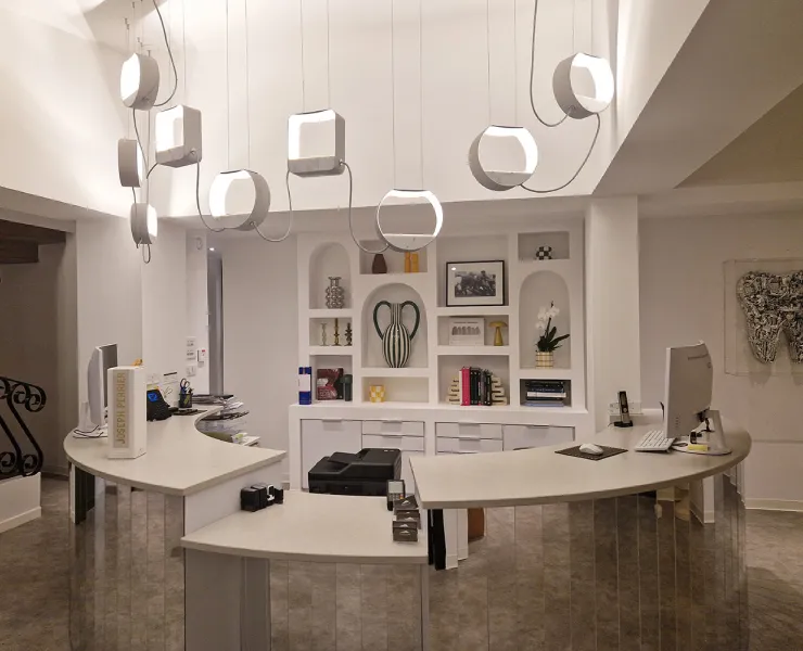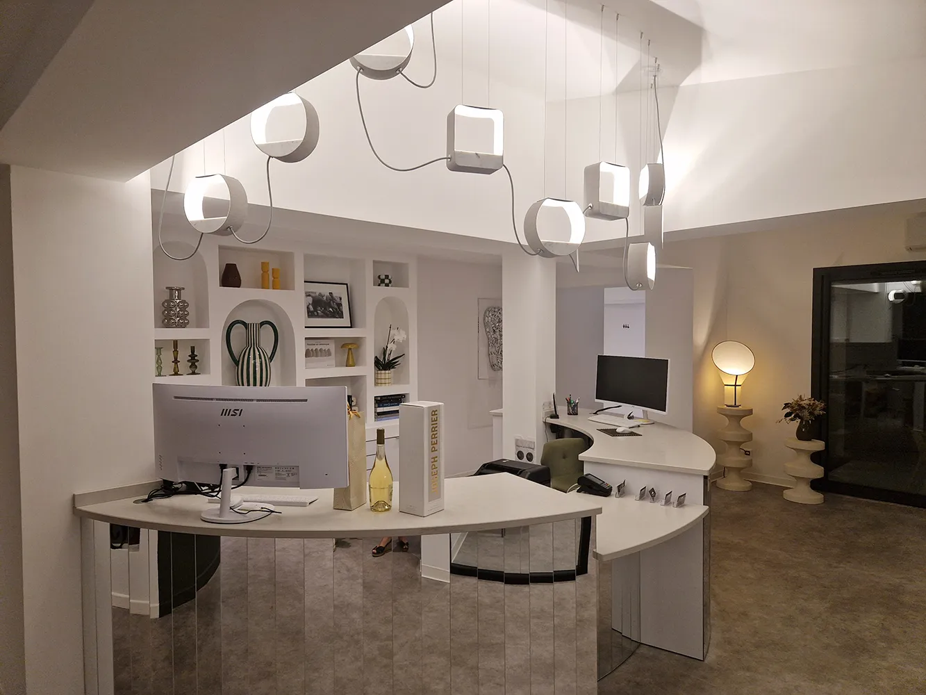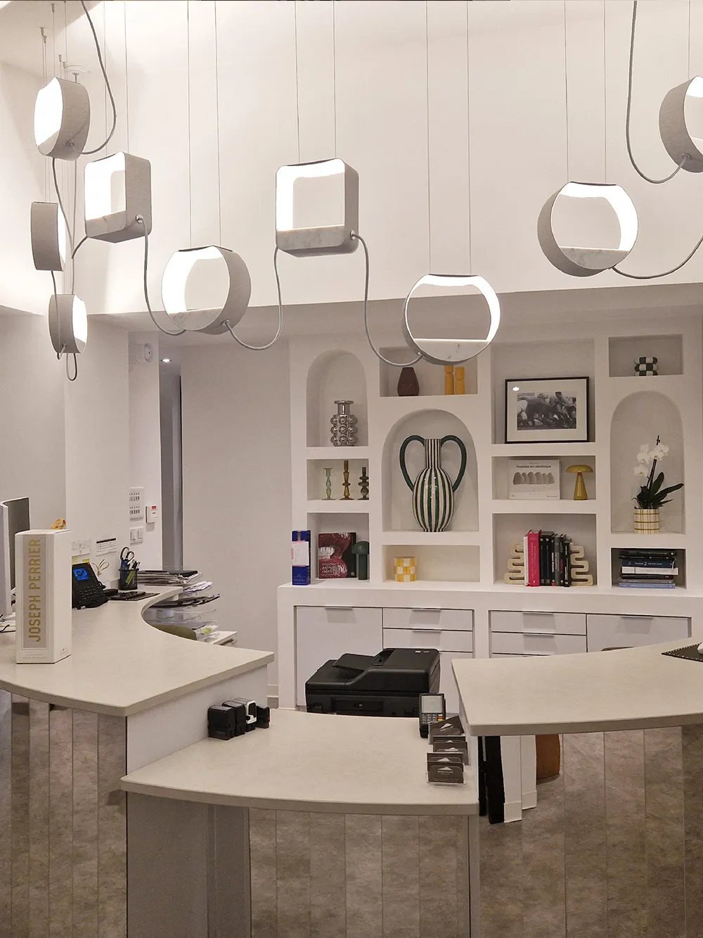 The reception area is enhanced by a 5 Petit Eau de Lumière pendant light, framed by two 2 Petit Rond pendant lights from the same collection. The layout, designed by our design office, follows the curve of the semi-circular counter and elegantly punctuates the space. The nine lampshades distributed above the reception area offer optimal visual comfort thanks to high-quality integrated LED light sources (3000K – CRI > 80), while preserving the fluidity of exchanges between patients and the secretarial staff.