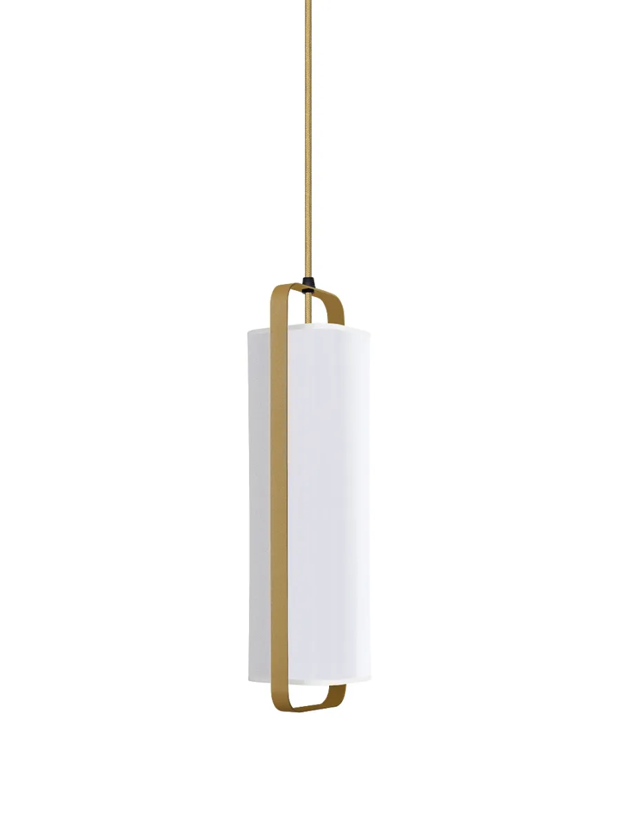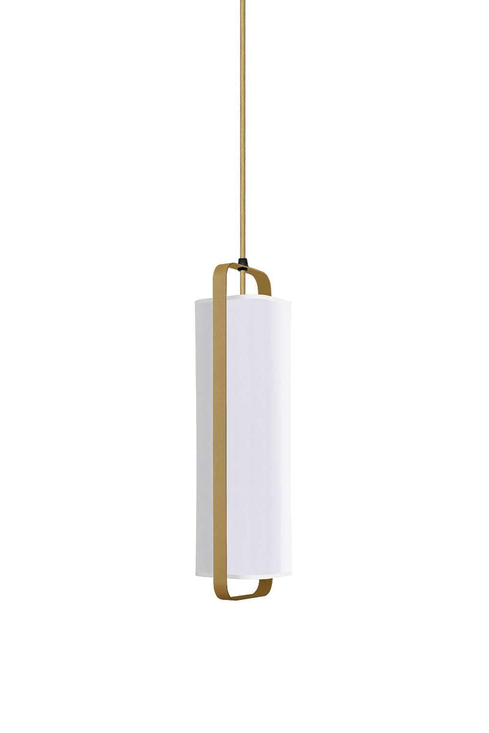 La suspension se compose d’un cadre en acier pailleté doré arrondi encadrant l’abat-jour en tissu blanc diffusant, suspendu par un fil textile d’alimentation en tissu doré et d’une patère dorée. La collection Twiggy au design élancé minimaliste et élégant, joue avec les contrastes, les textures, la géométrie, en mettant en valeur la matière textile avec un halo lumineux tamisé comme une bougie.