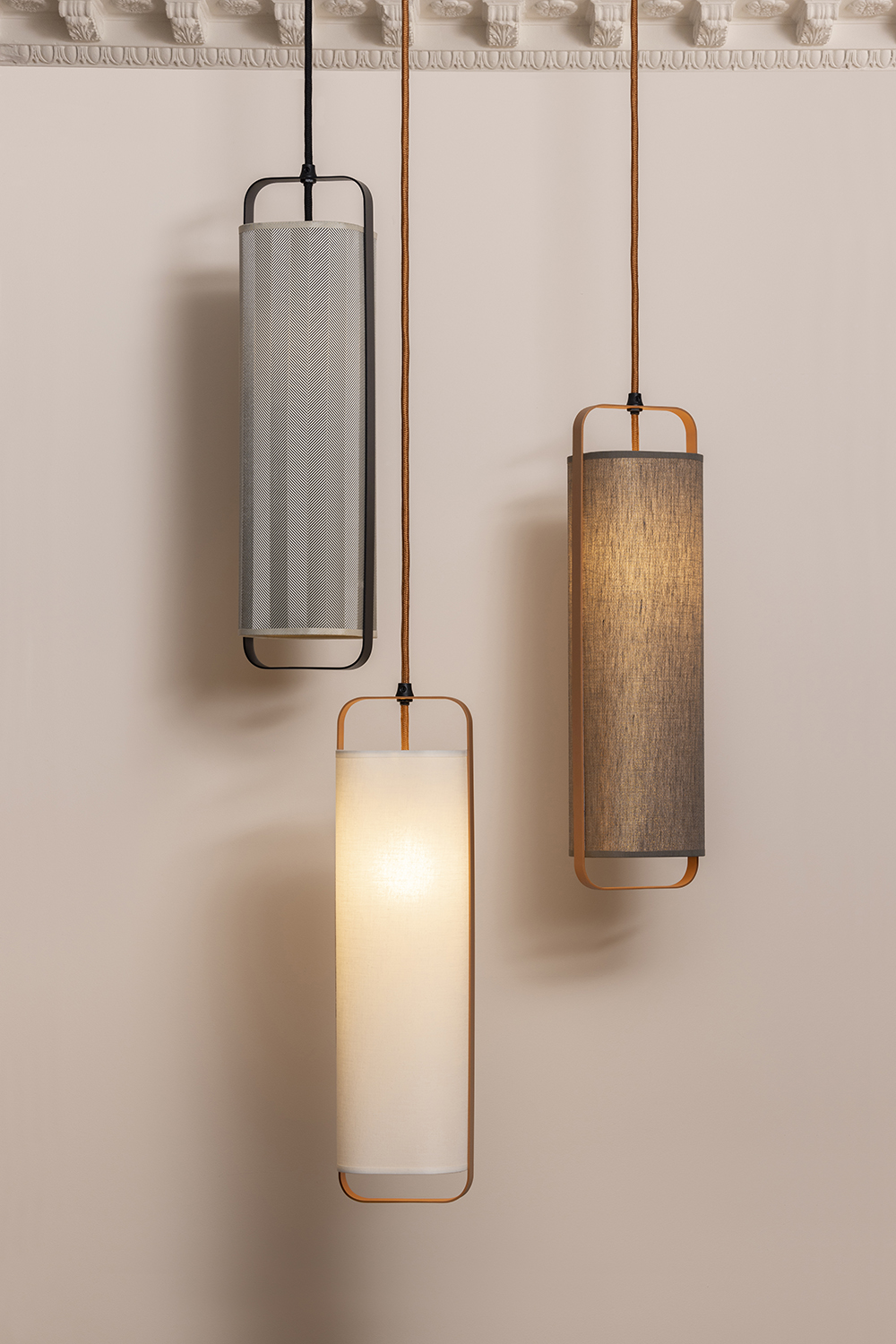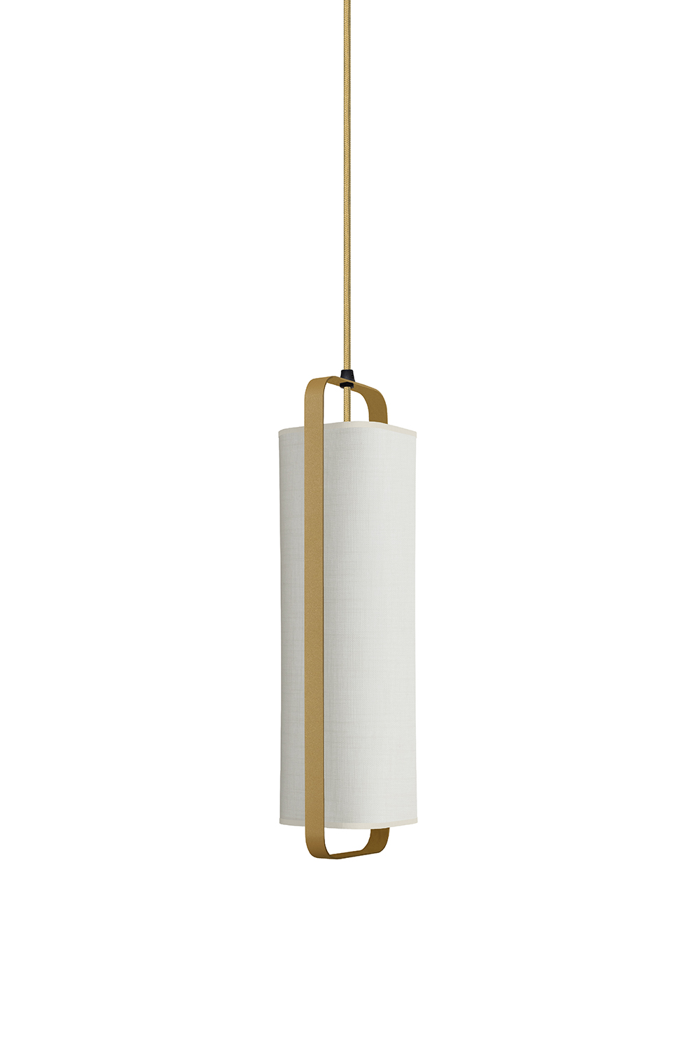 La suspension se compose d’un cadre en acier pailleté doré arrondi encadrant l’abat-jour en lin blanc crème, suspendu par un fil textile d’alimentation en tissu doré et d’une patère dorée. La collection Twiggy au design élancé minimaliste et élégant, joue avec les contrastes, les textures, la géométrie, en mettant en valeur la matière textile avec un halo lumineux tamisé comme une bougie.